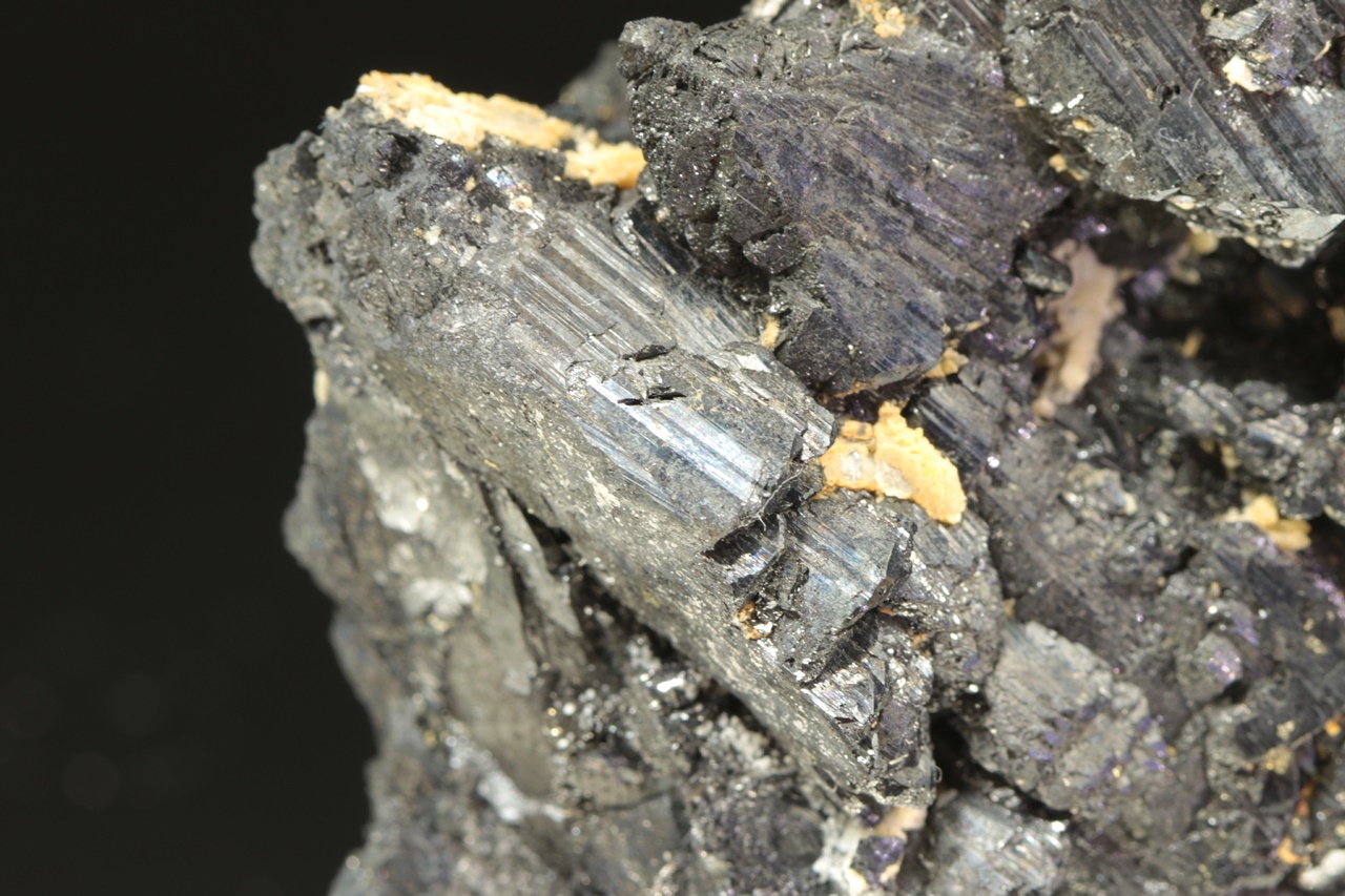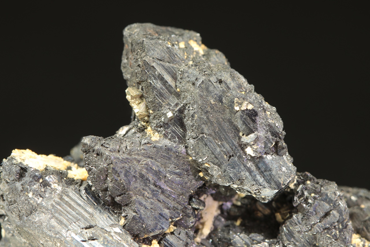 Cluster of black wolframite crystals with characteristic striations. The largest crystal is 2.5 cm in size.