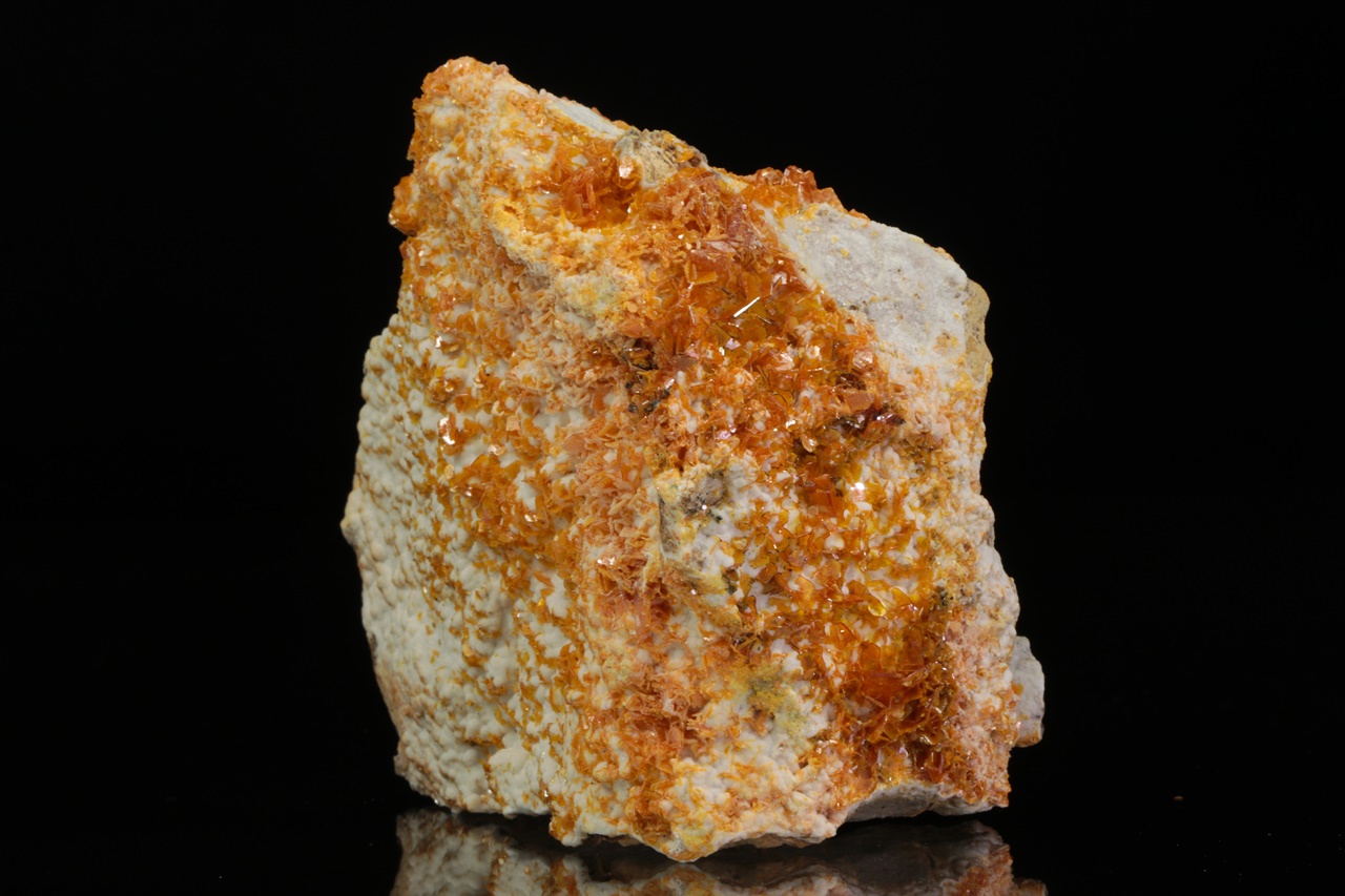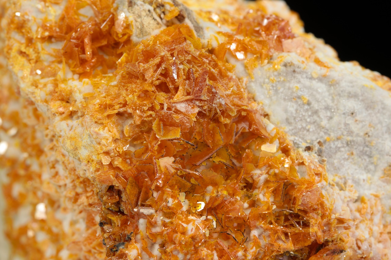 Bright orange tabular crystals of Wulfenite up to 4 mm in size grown on contrasting white Aragonite.