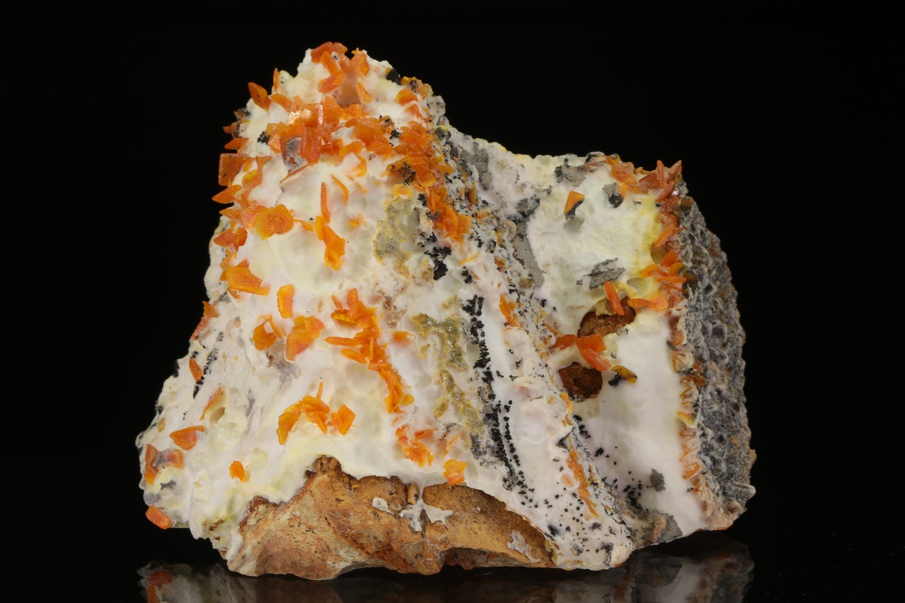 Intensely orange tabular wulfenite crystals, about 5 mm in size, grown on white fine-grained aragonite.