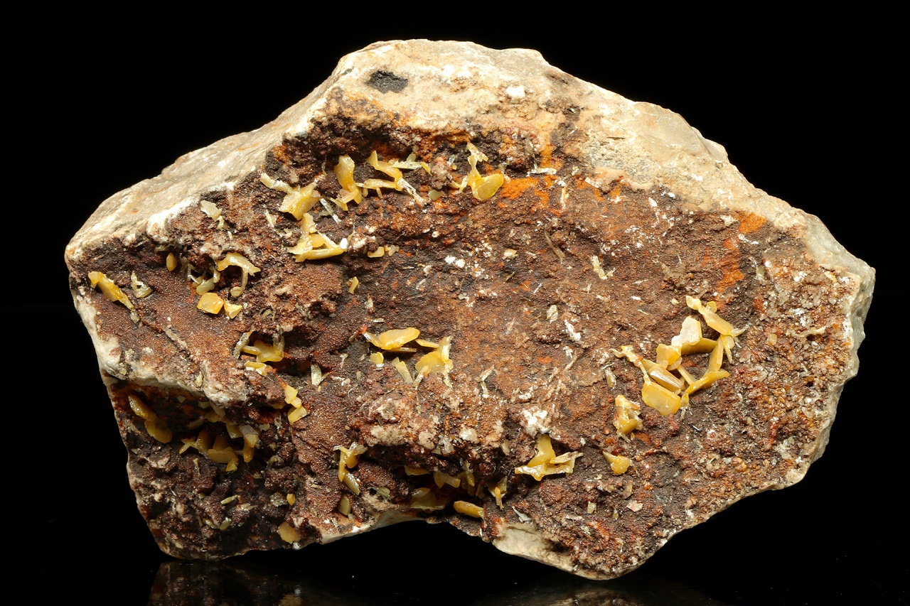 Glossy tabular crystals of yellow wulfenite up to 5 mm in size from the type locality.
