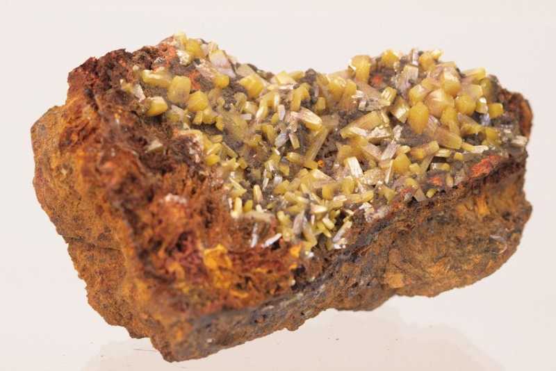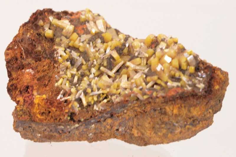 A molybdate specimen from a classic locality. Elongated yellow Wulfenite crystals.