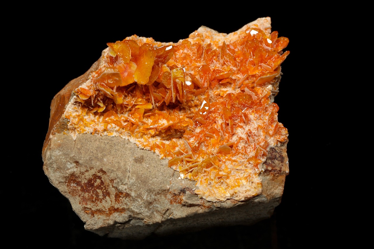 A druse of richly orange, tabular wulfenite crystals. Notably, the upper part of the specimen features skeletal crystals up to 13 mm in size.