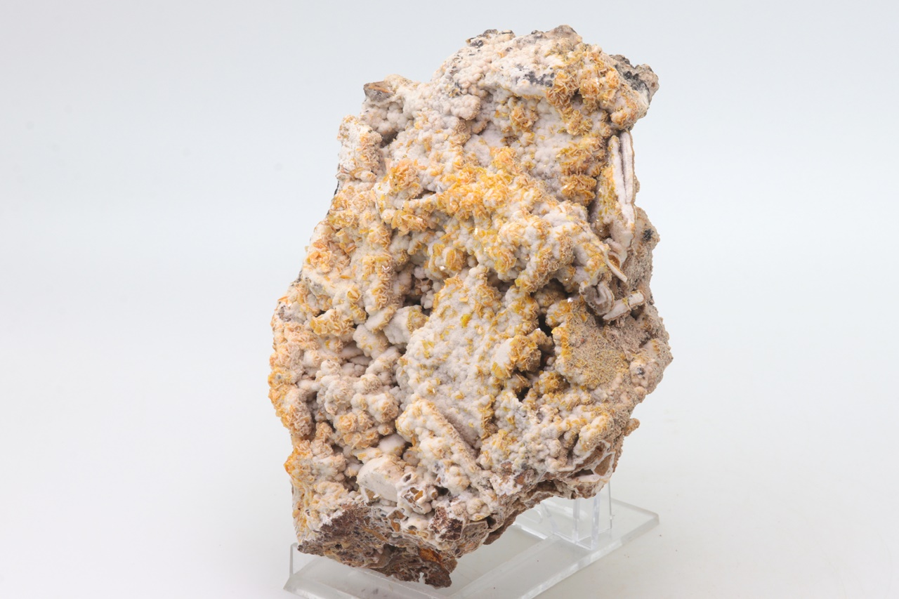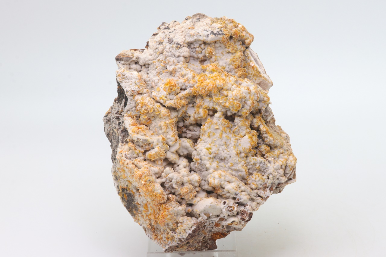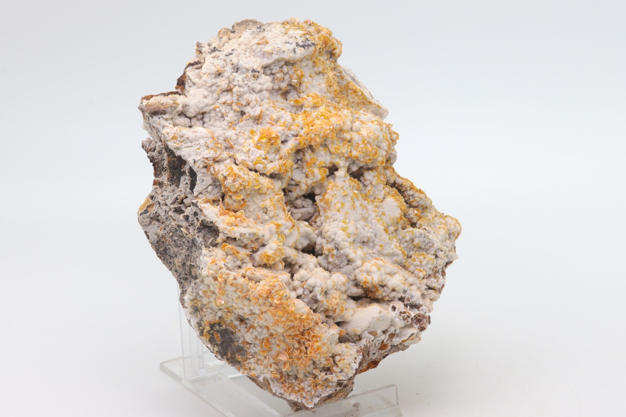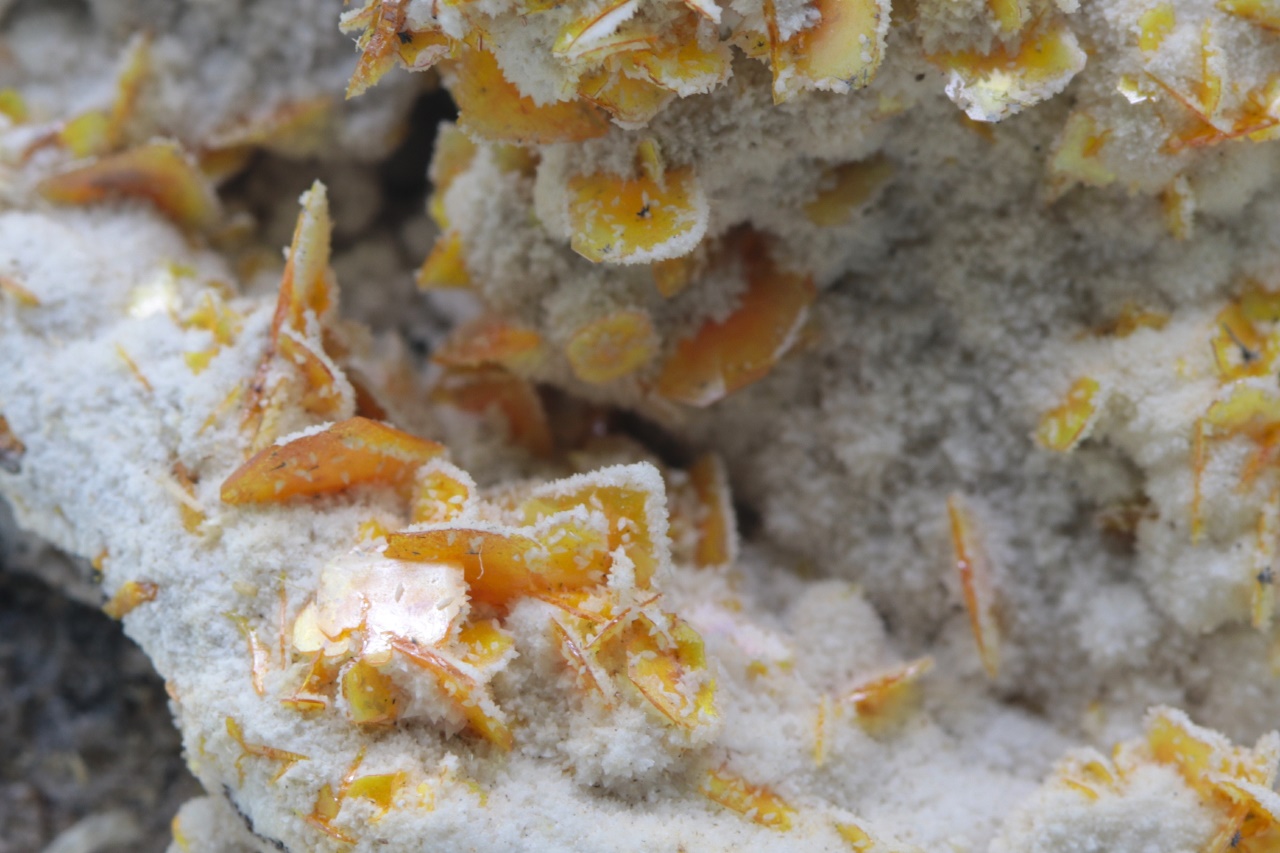 Tabular glossy crystals of orange Wulfenite partially embedded and overgrown with white Calcite. The largest crystals are about 3 mm in size. The sample must be picked up in store.
