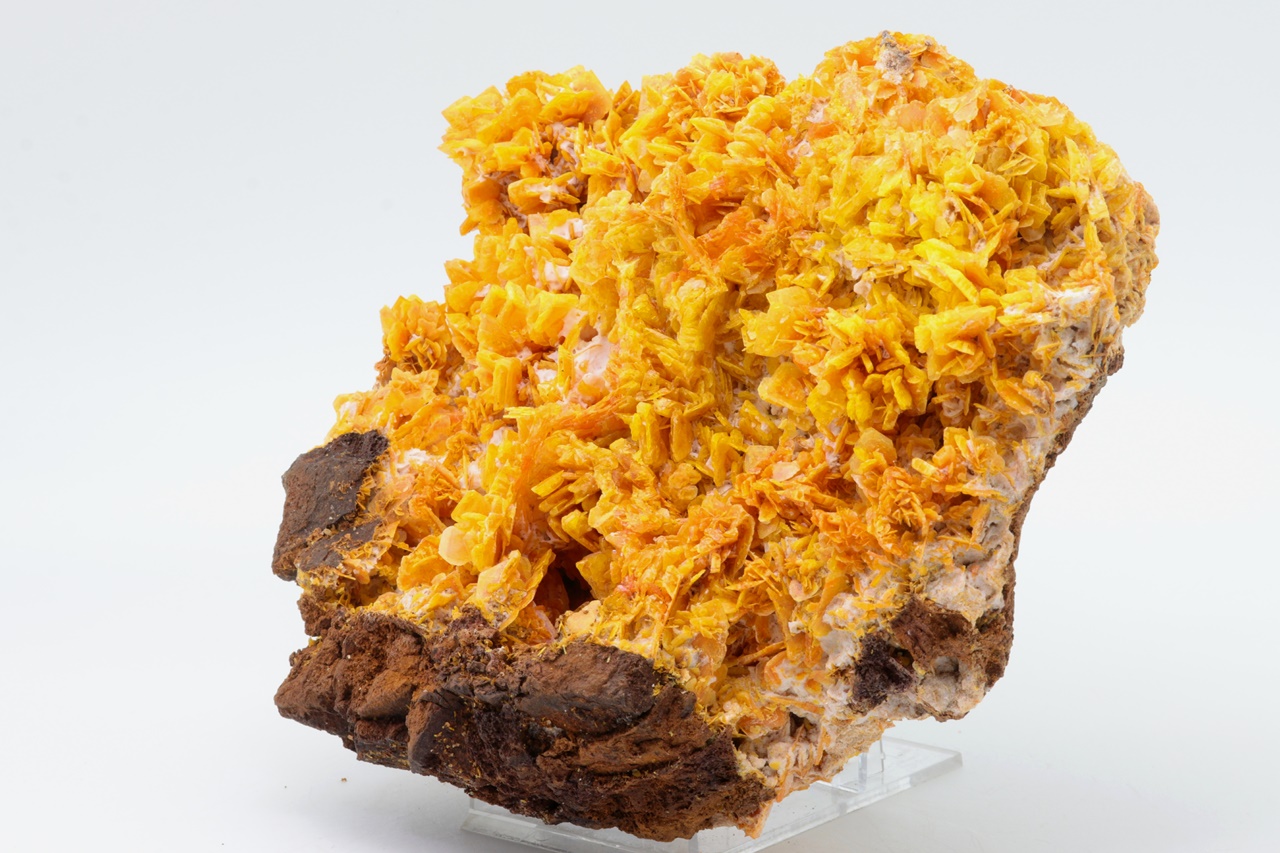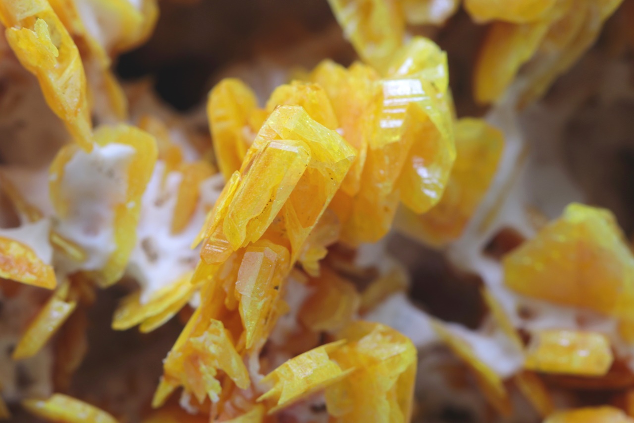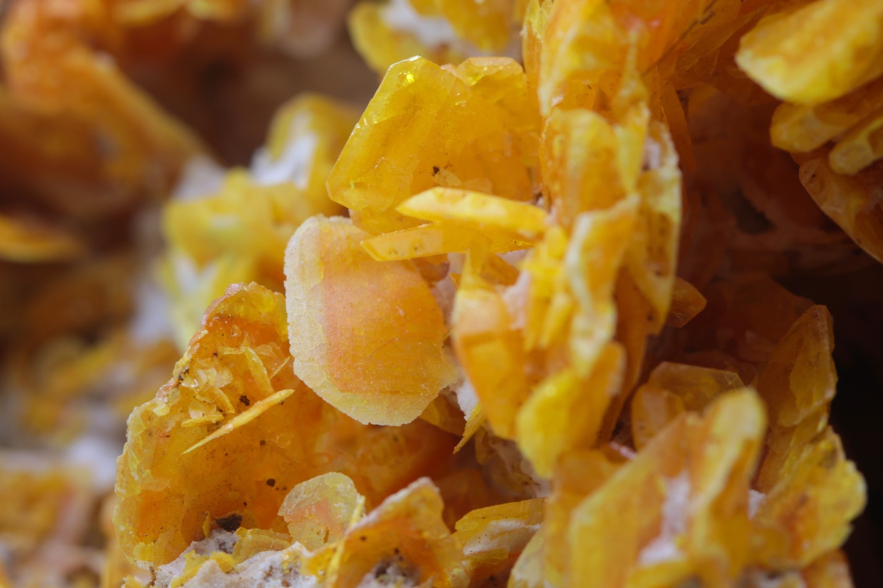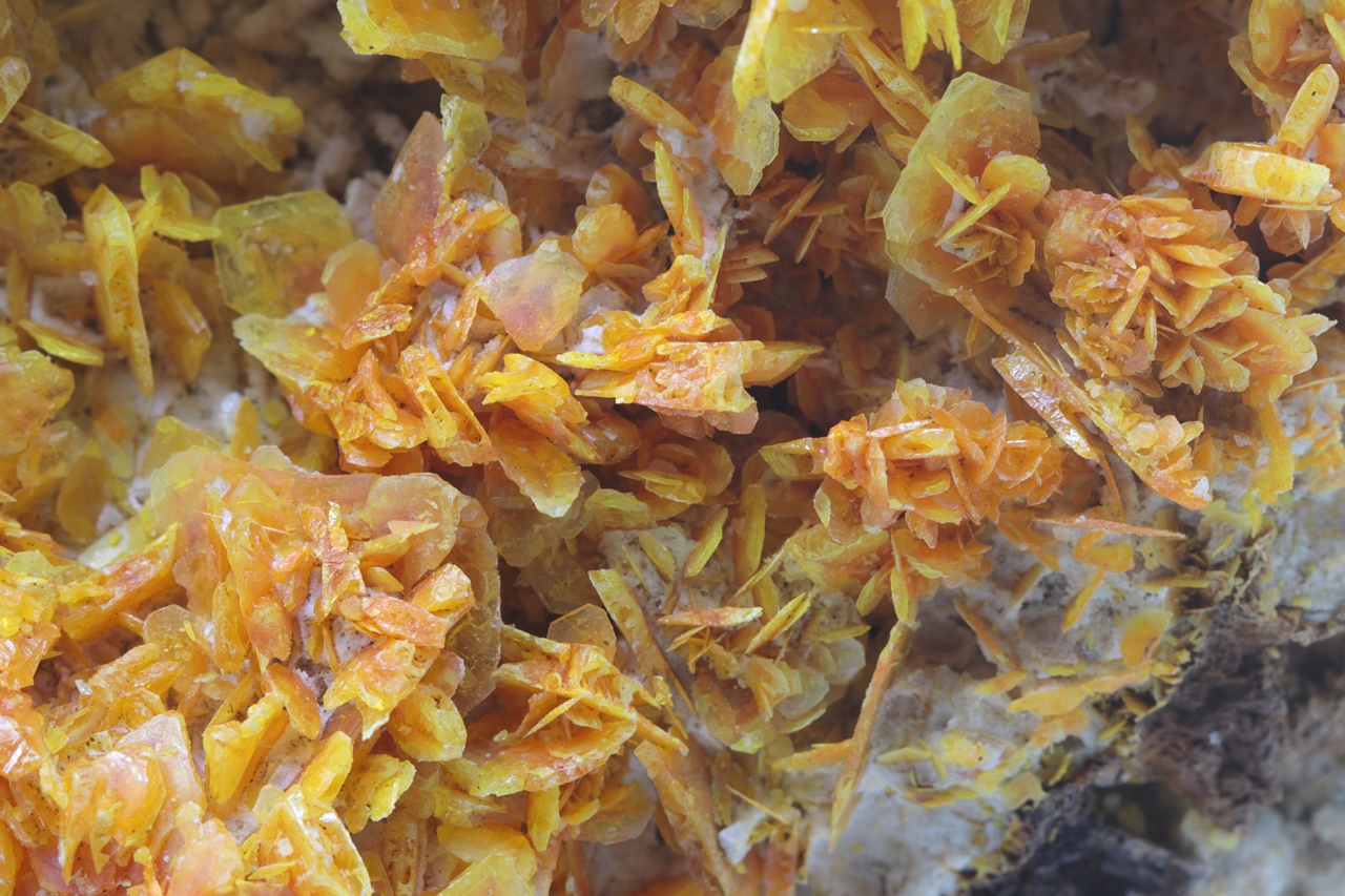 An exceptionally large, aesthetic druze consisting of richly intergrown, silky lustrous wulfenite crystals, some of which have a skeletal development. The crystals are zonal with a more orange center and edges transitioning to yellow. The largest crystals are approximately 1 cm in size. The sample must be picked up at the store.