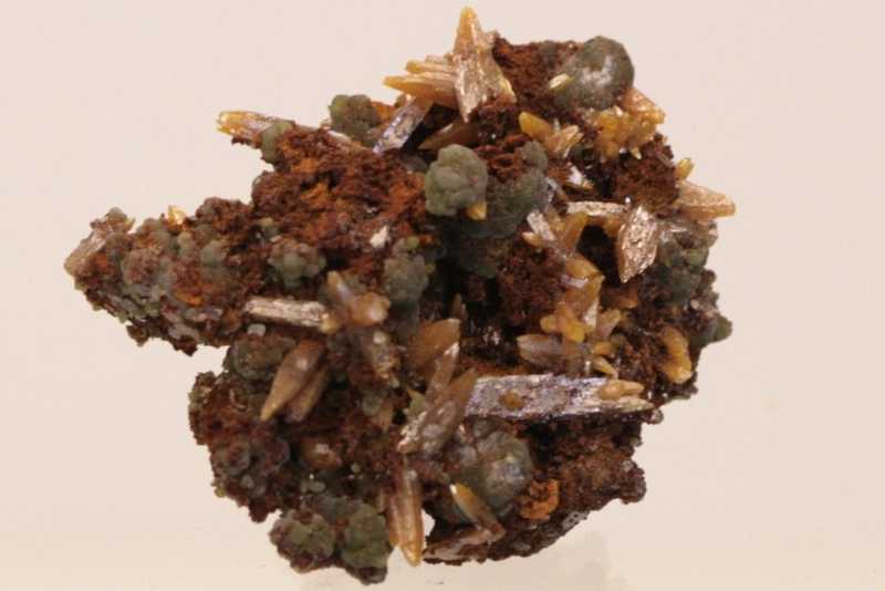 Wulfenite crystals up to 2 mm in size.. Yellow wulfenite with green spherical aggregates of mimetite.