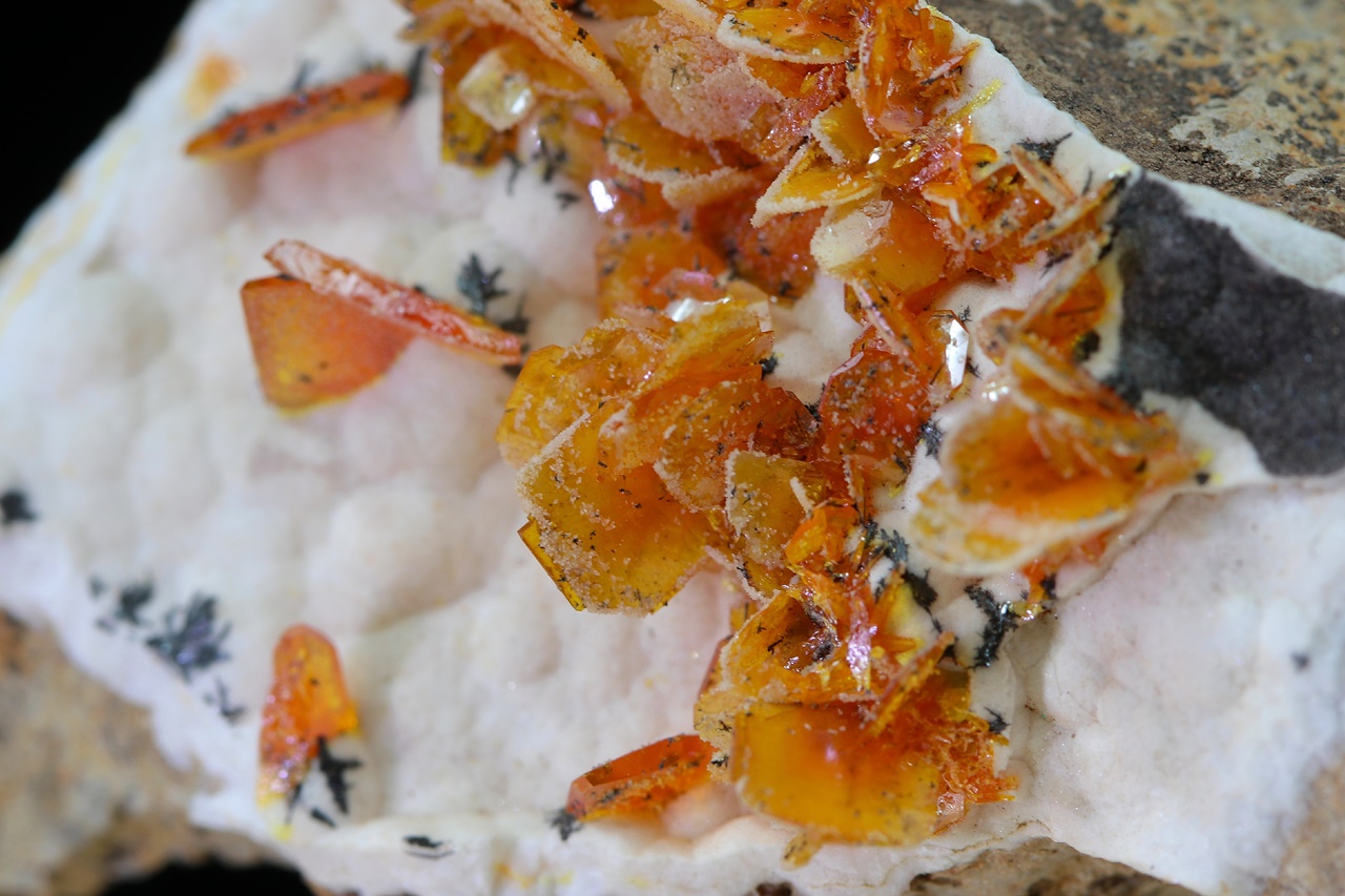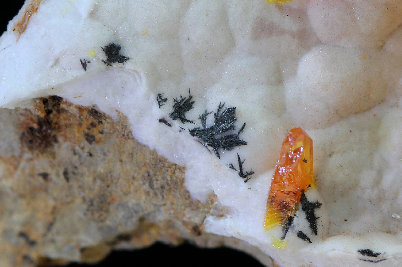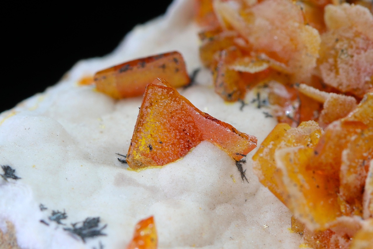 Beautiful, orange, tabular wulfenite crystals grown on white aragonite with needles of black lead oxide – plattnerite. The largest wulfenite crystal is 5 mm in size.