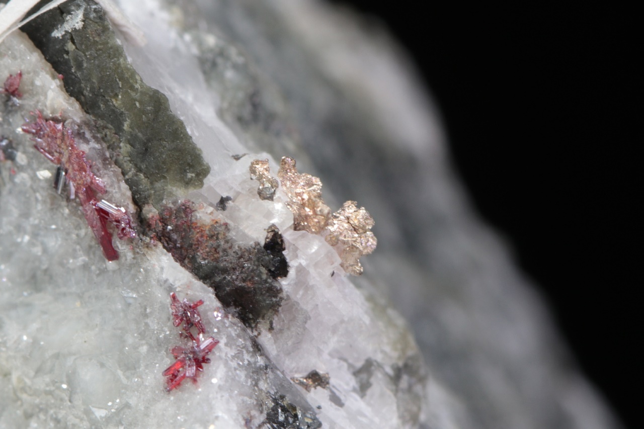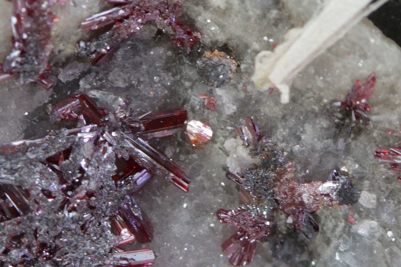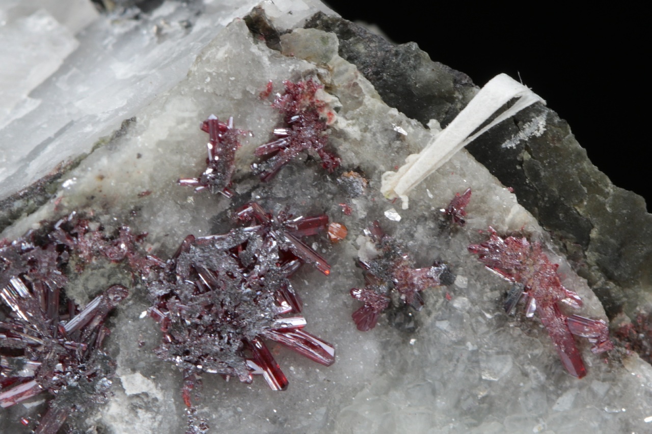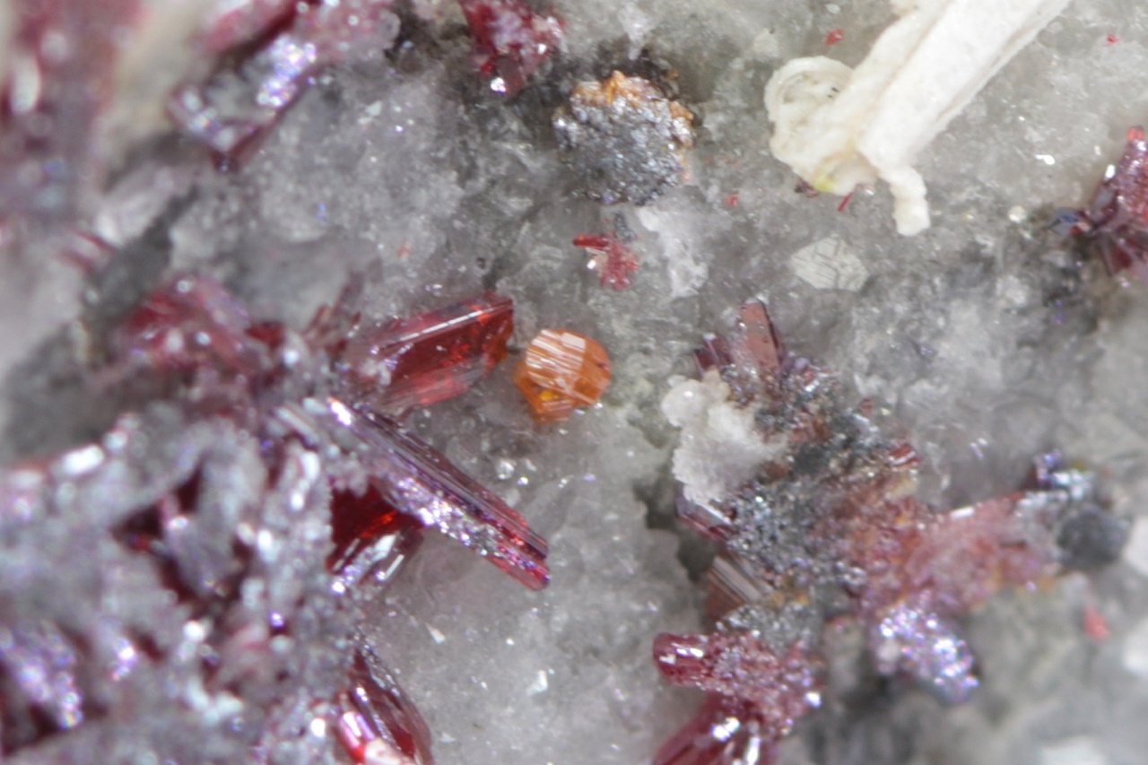The specien is dominated by brightly red, glossy porustite crystals richly grown on white calcite; also present on the sample are two aggregates of native silver (the larger one measures 4 mm) and a crystal of the rare orange Xanthoconite. An unusual combination of silver minerals!