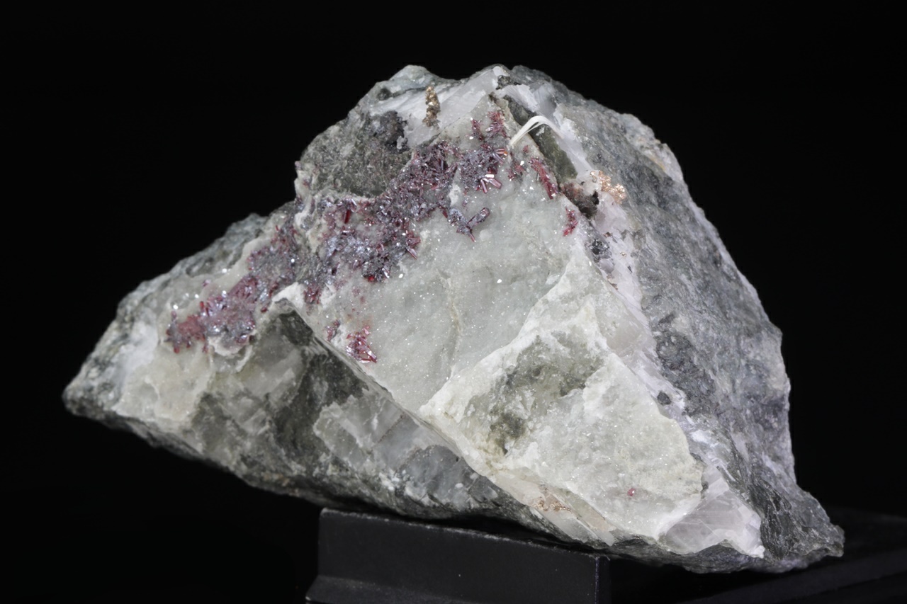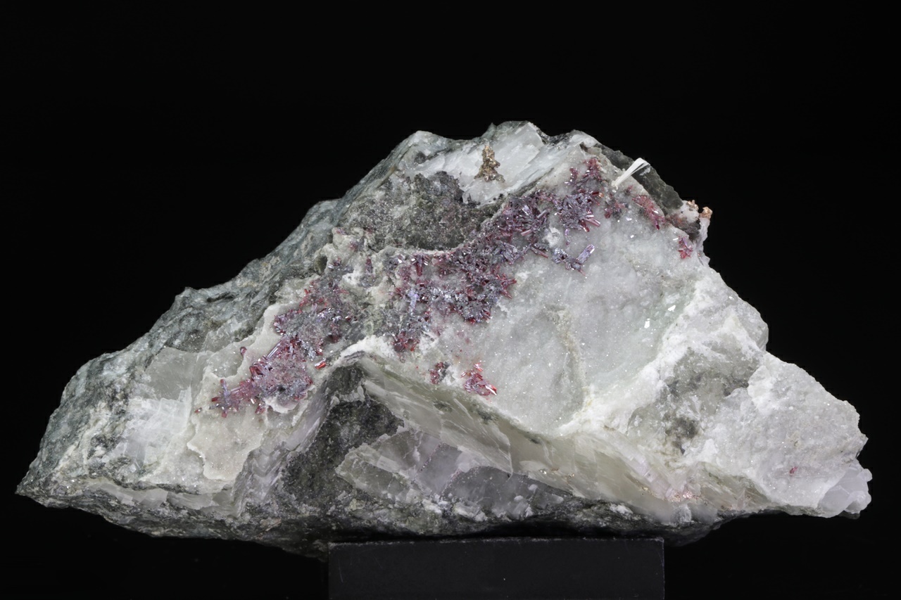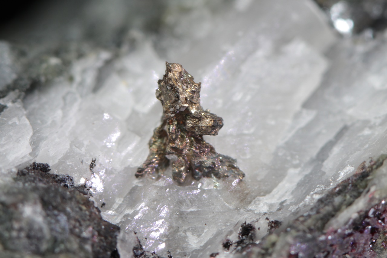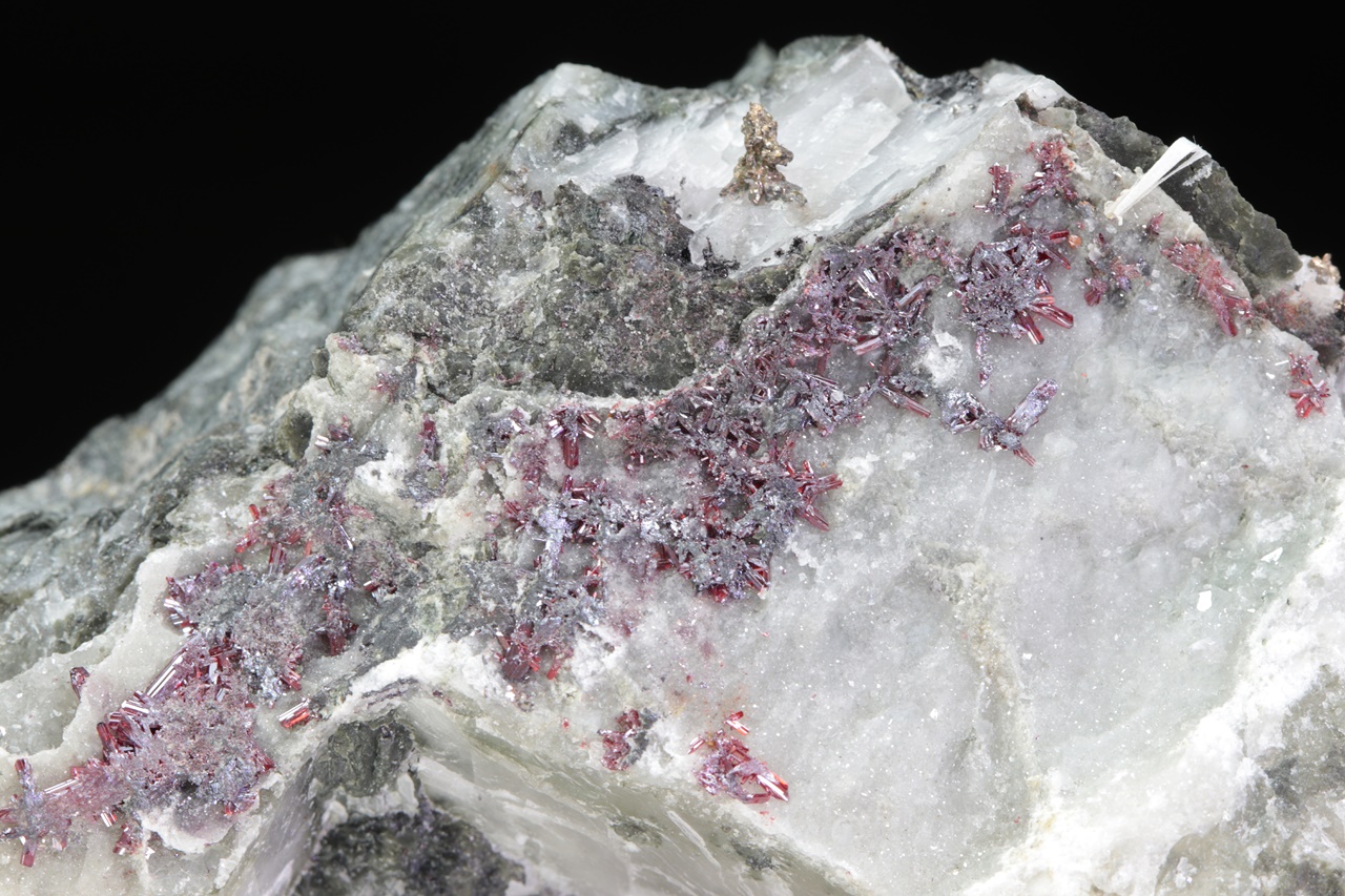 The specien is dominated by brightly red, glossy porustite crystals richly grown on white calcite; also present on the sample are two aggregates of native silver (the larger one measures 4 mm) and a crystal of the rare orange Xanthoconite. An unusual combination of silver minerals!