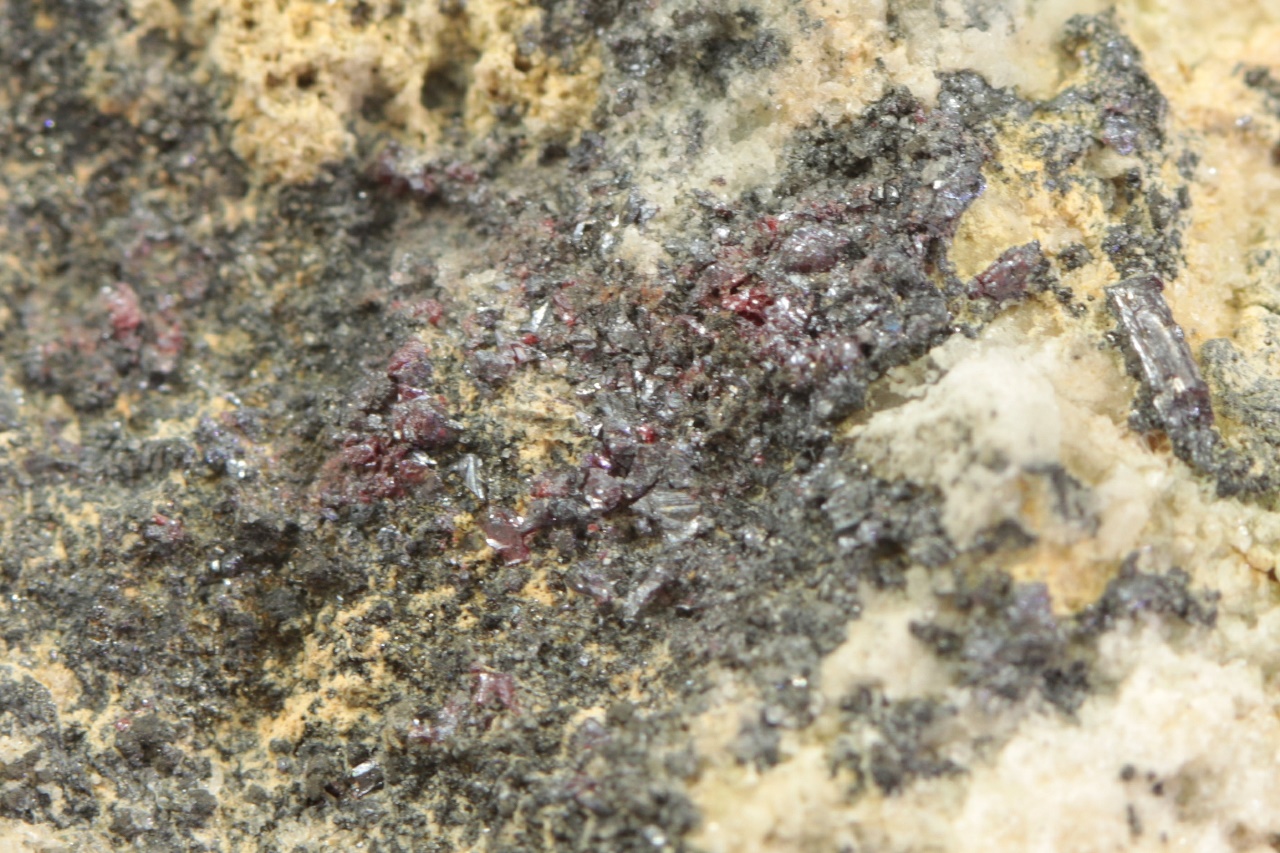 Unusually large (1.5 mm) aggregate of rare orange xanthoconite crystals with a group of intensely red proustite crystals up to 1 mm in size.
