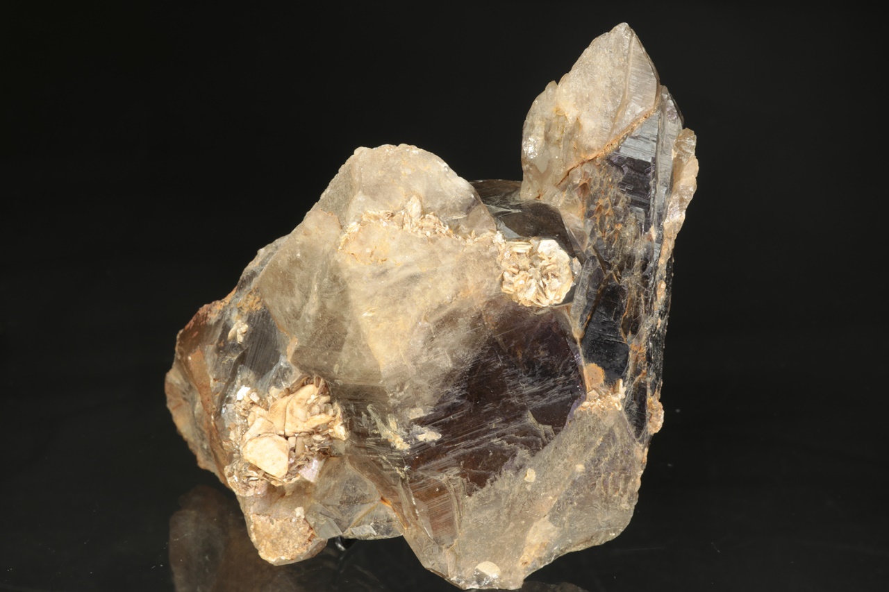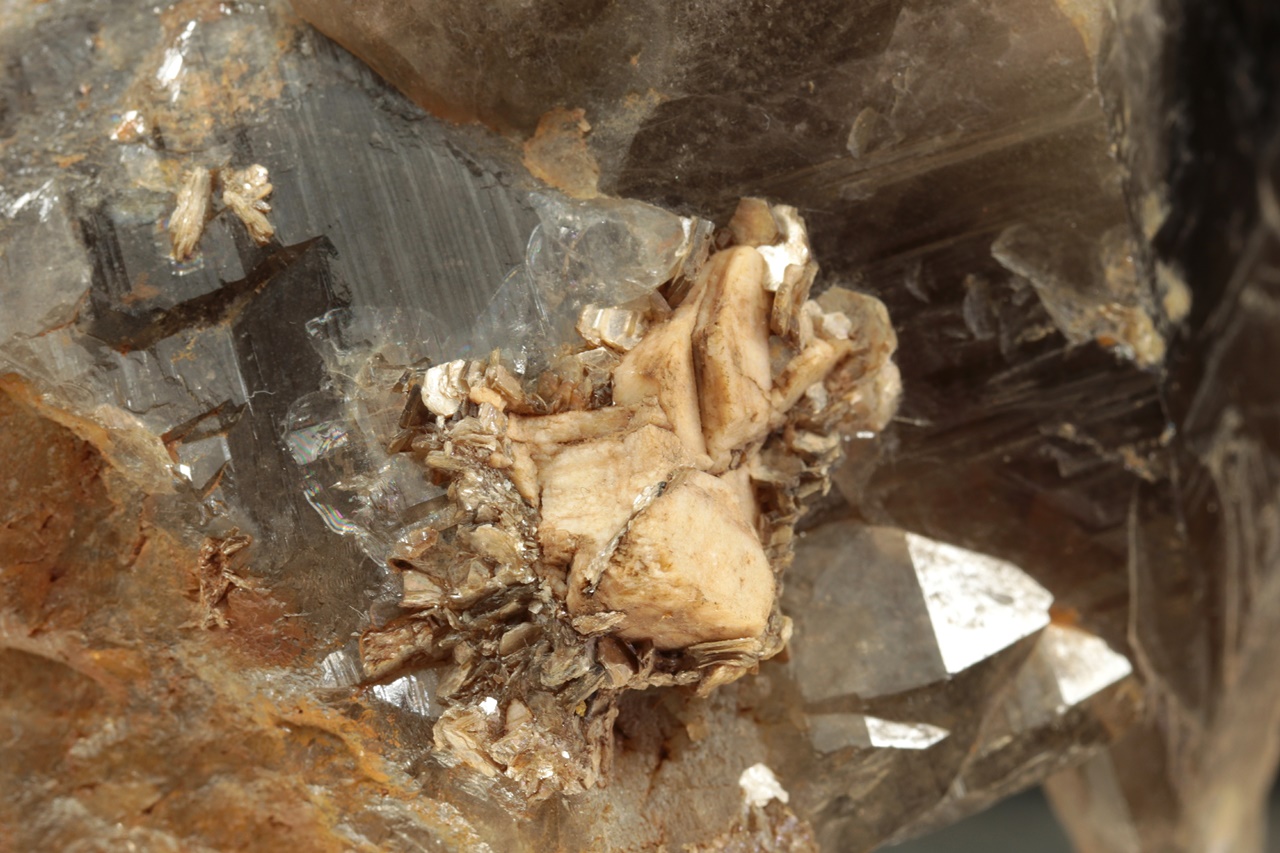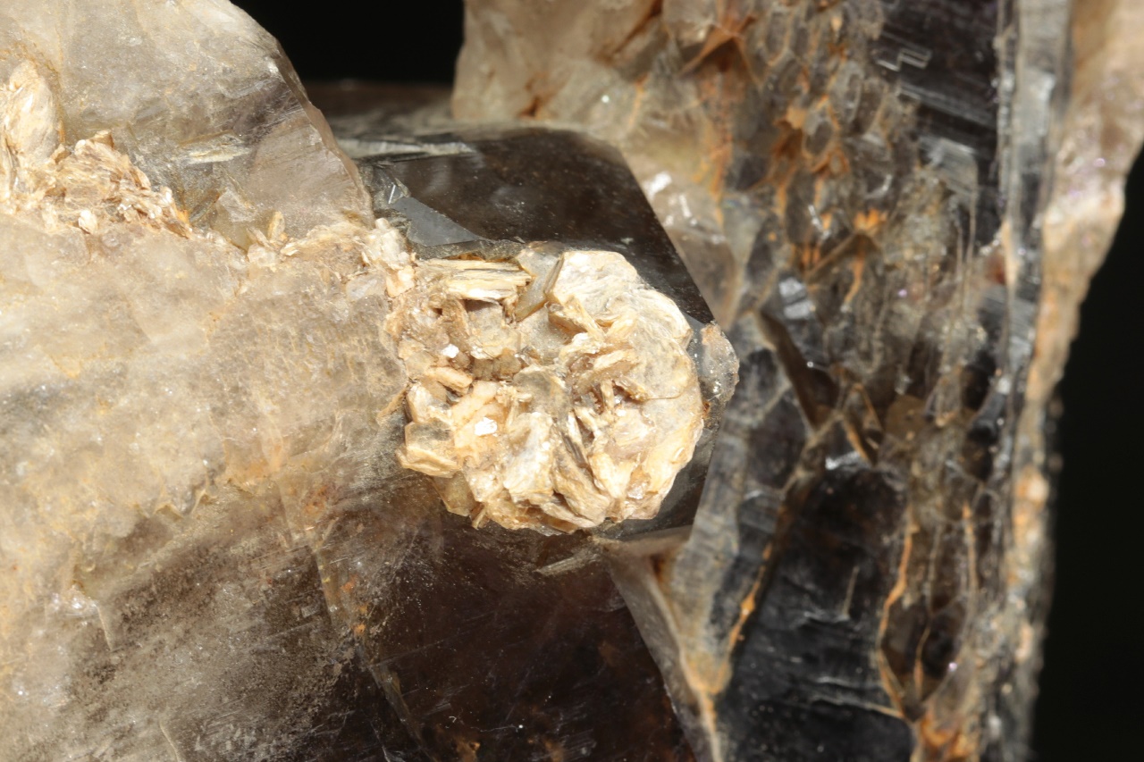 Srostlice tří krystalů tmavé záhnědy s tabulkami cinvalditu a béžovým živcem. Krystaly jsou ze zadní strany dohojené.