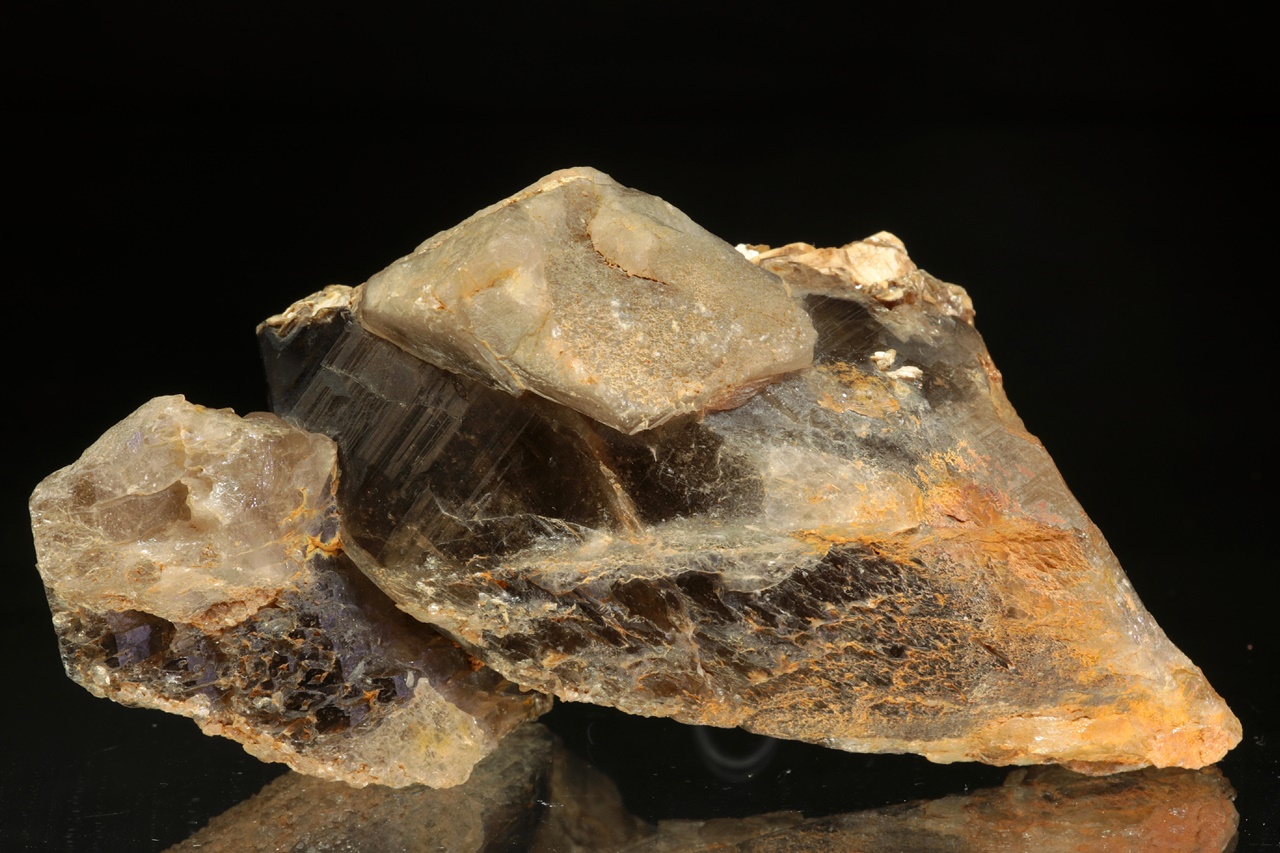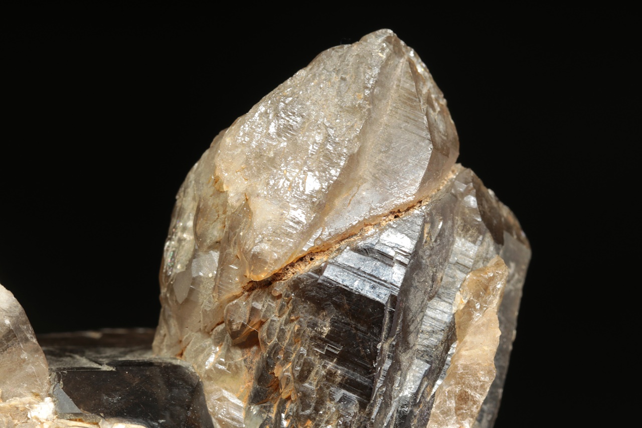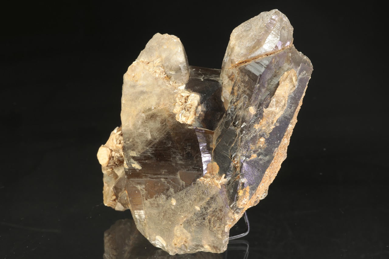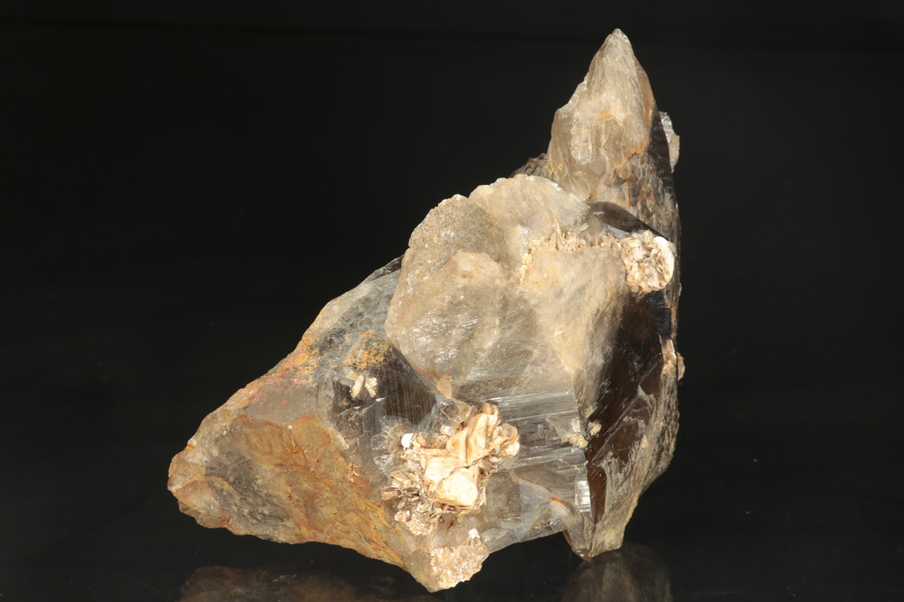 Srostlice tří krystalů tmavé záhnědy s tabulkami cinvalditu a béžovým živcem. Krystaly jsou ze zadní strany dohojené.