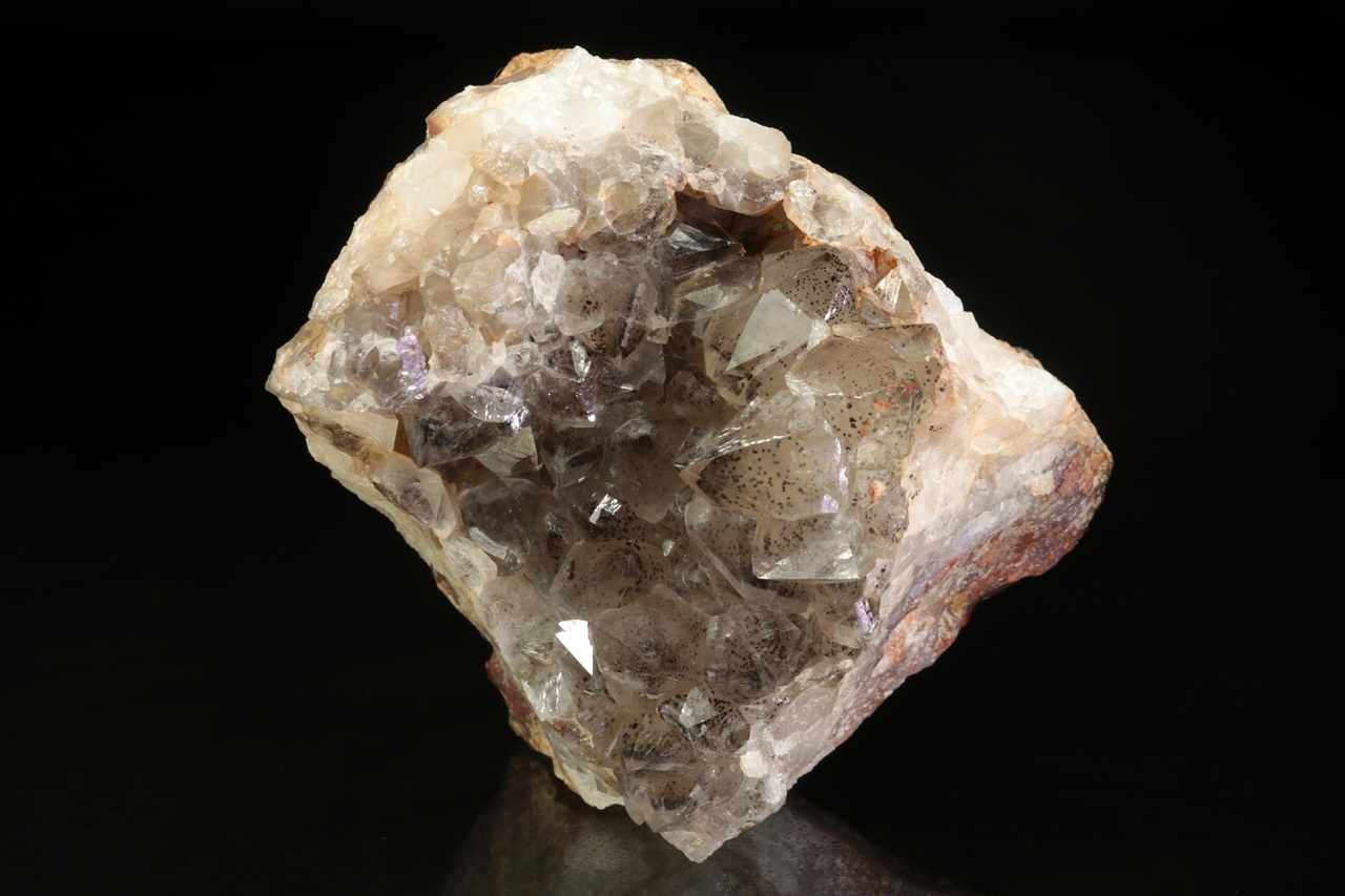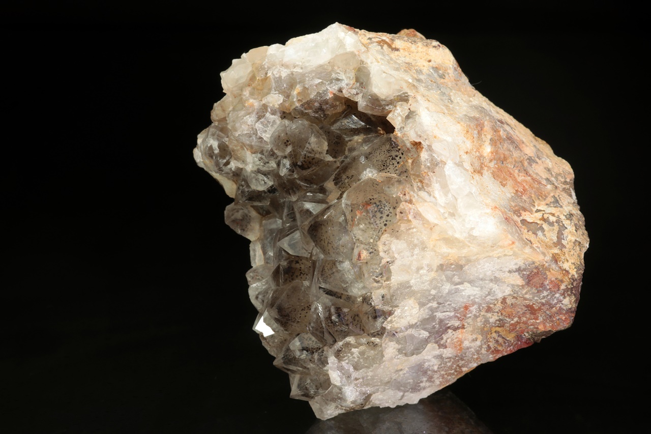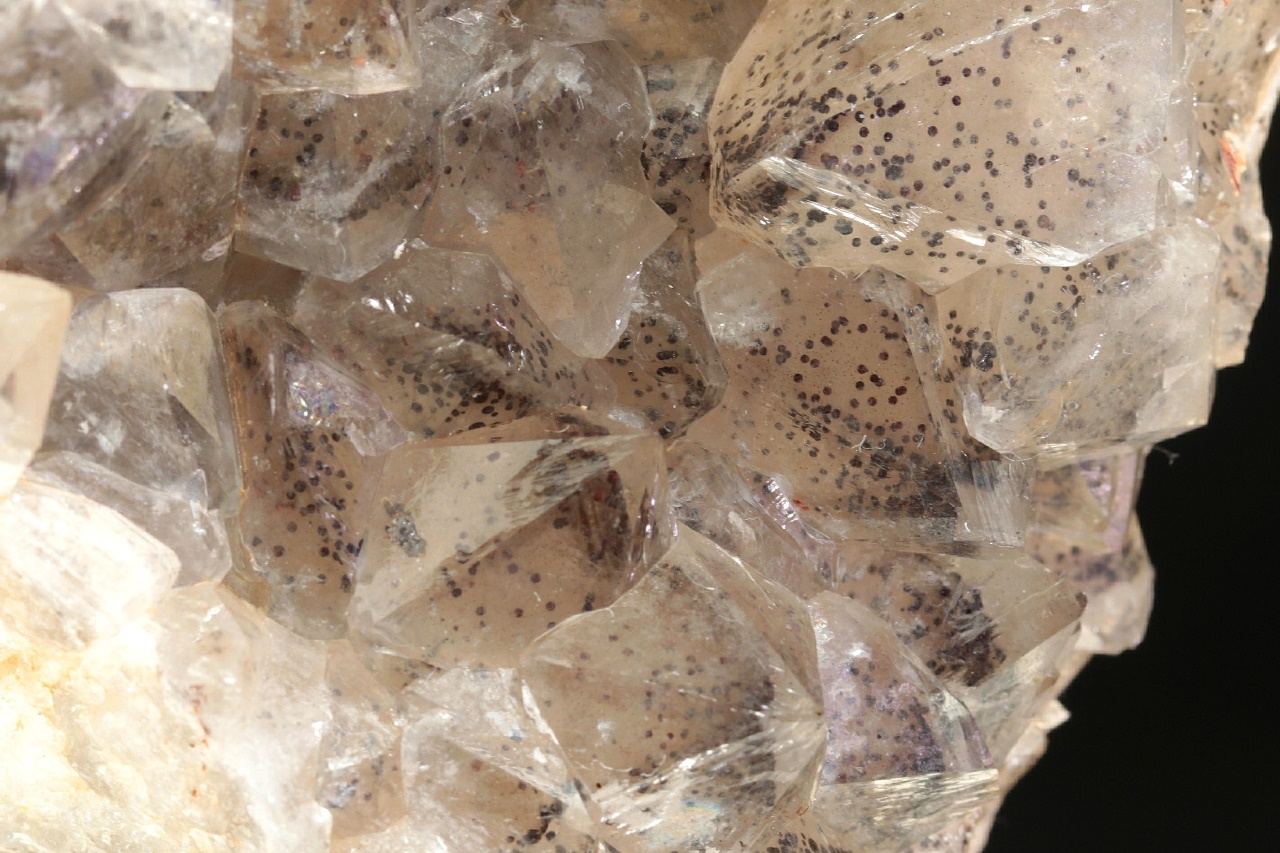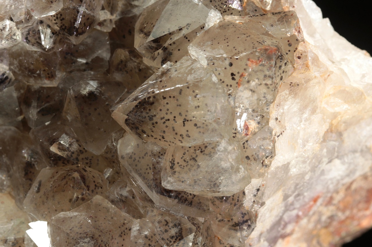 Drúza světlých průhledných krystalů záhnědy se zarostlými kuličkami goethitu.