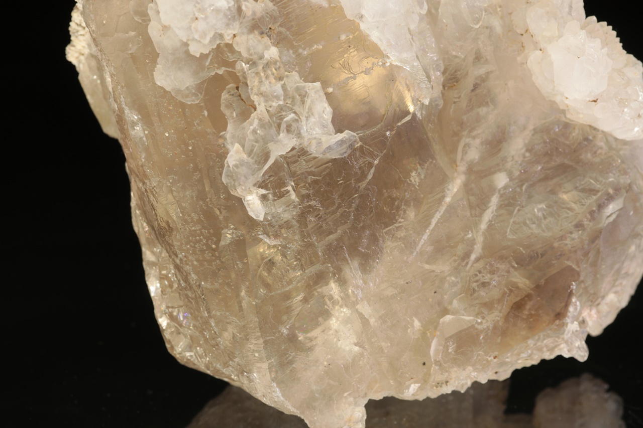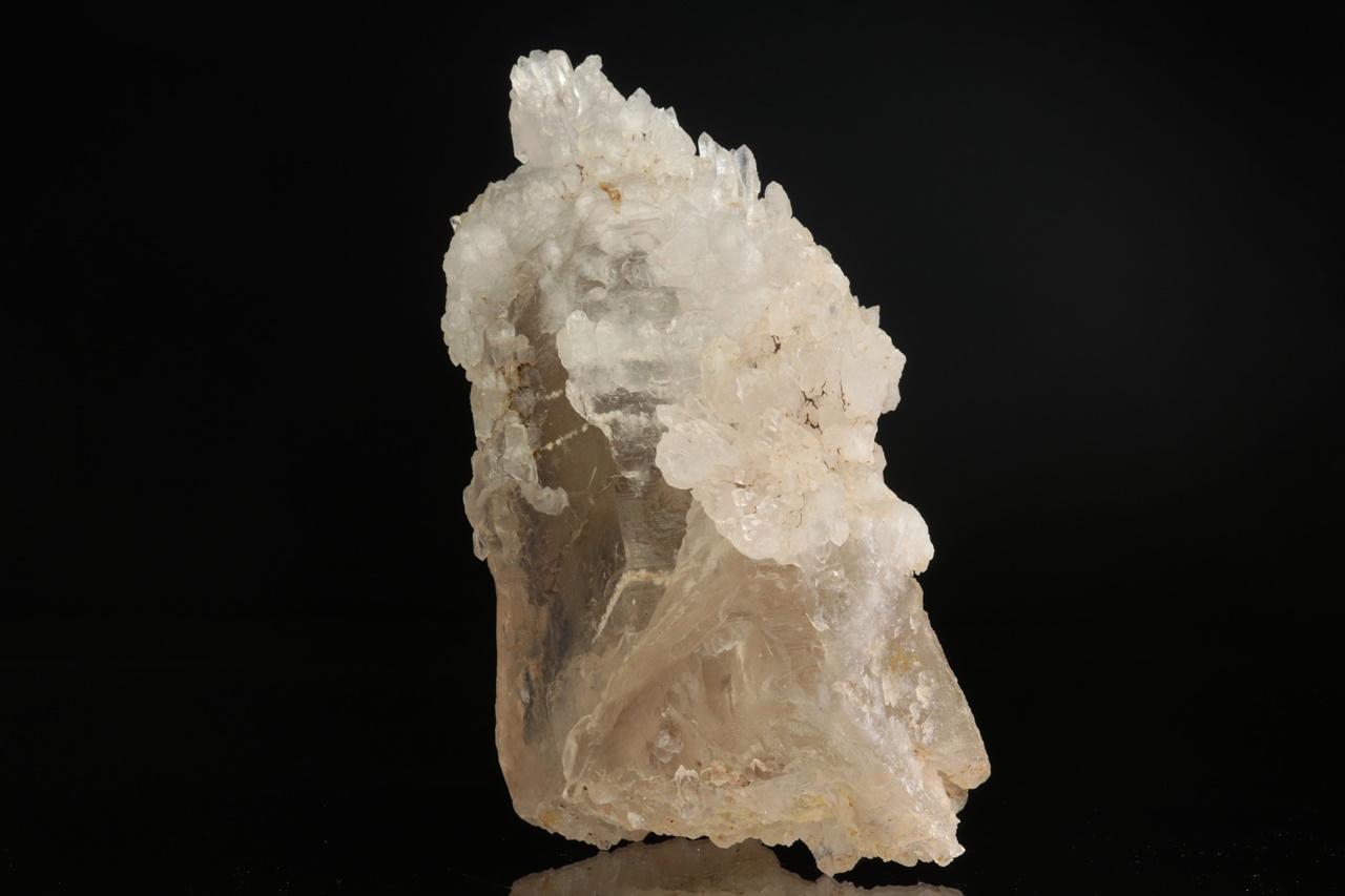 A large light brownish crystal overgrown with younger hypoparallel crystals of white quartz. Mica and feldspar are also present on the sample.