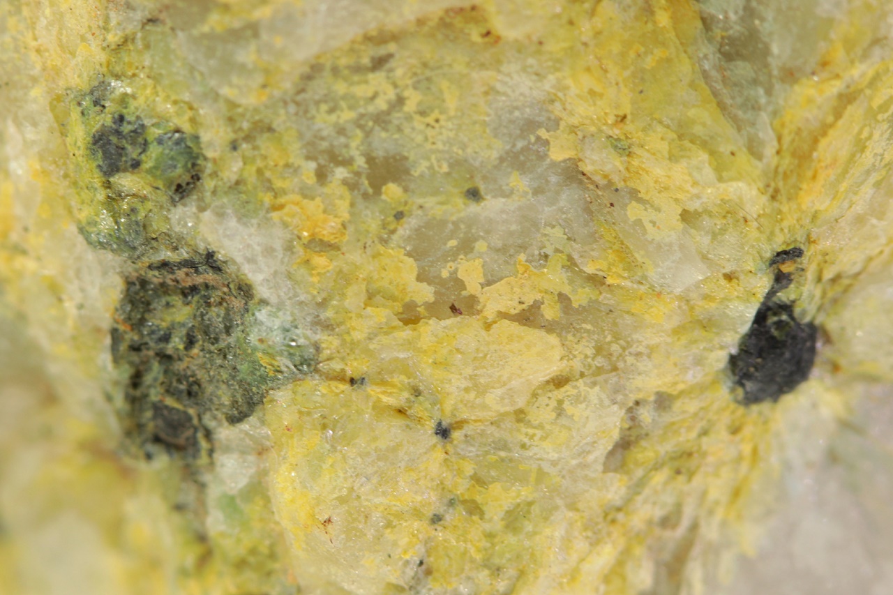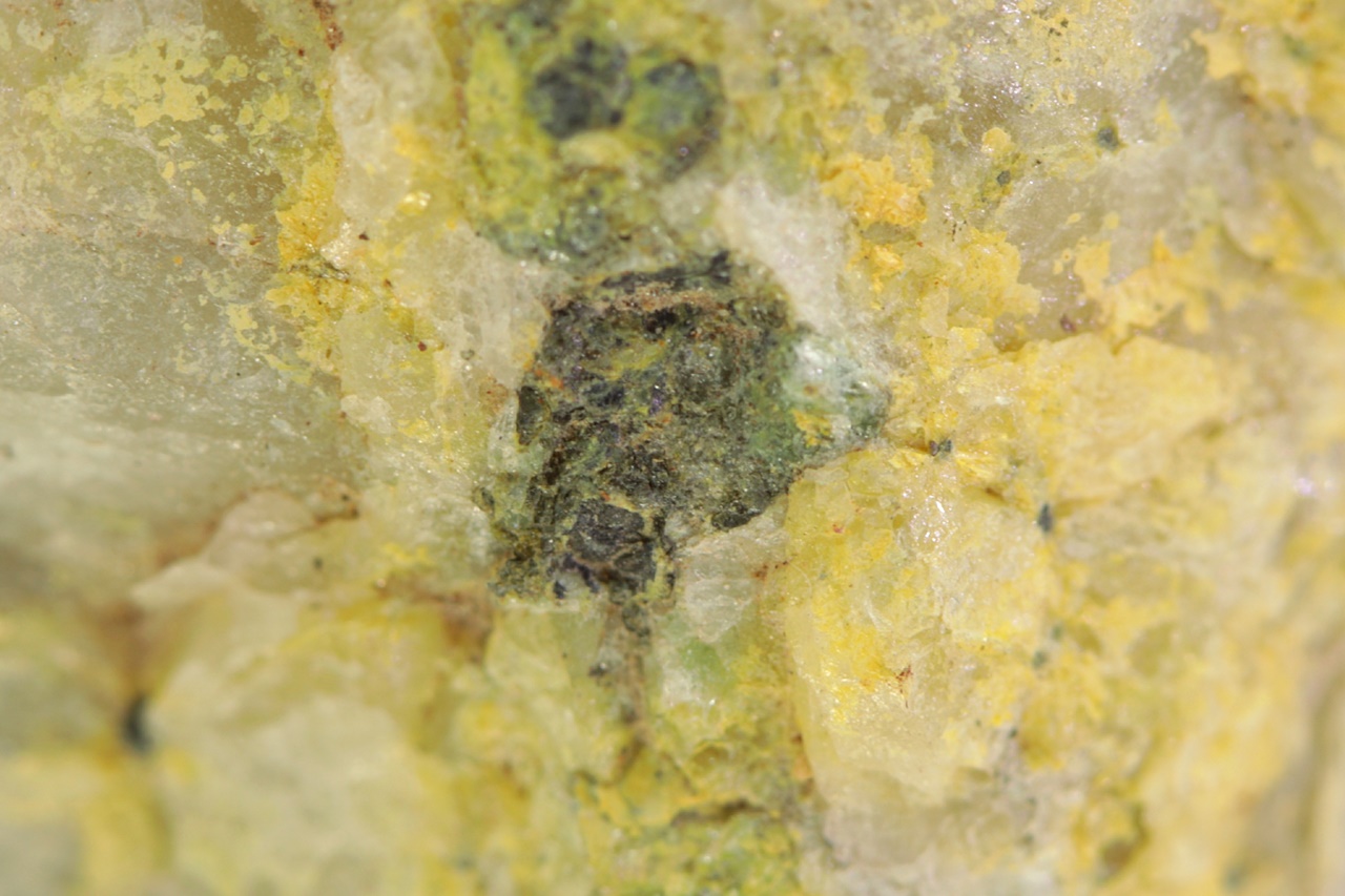 Black grains of zavaritskite growing through preisingerite surrounded by yellow russellite. The largest grain of zavaritskite is 5 mm big.