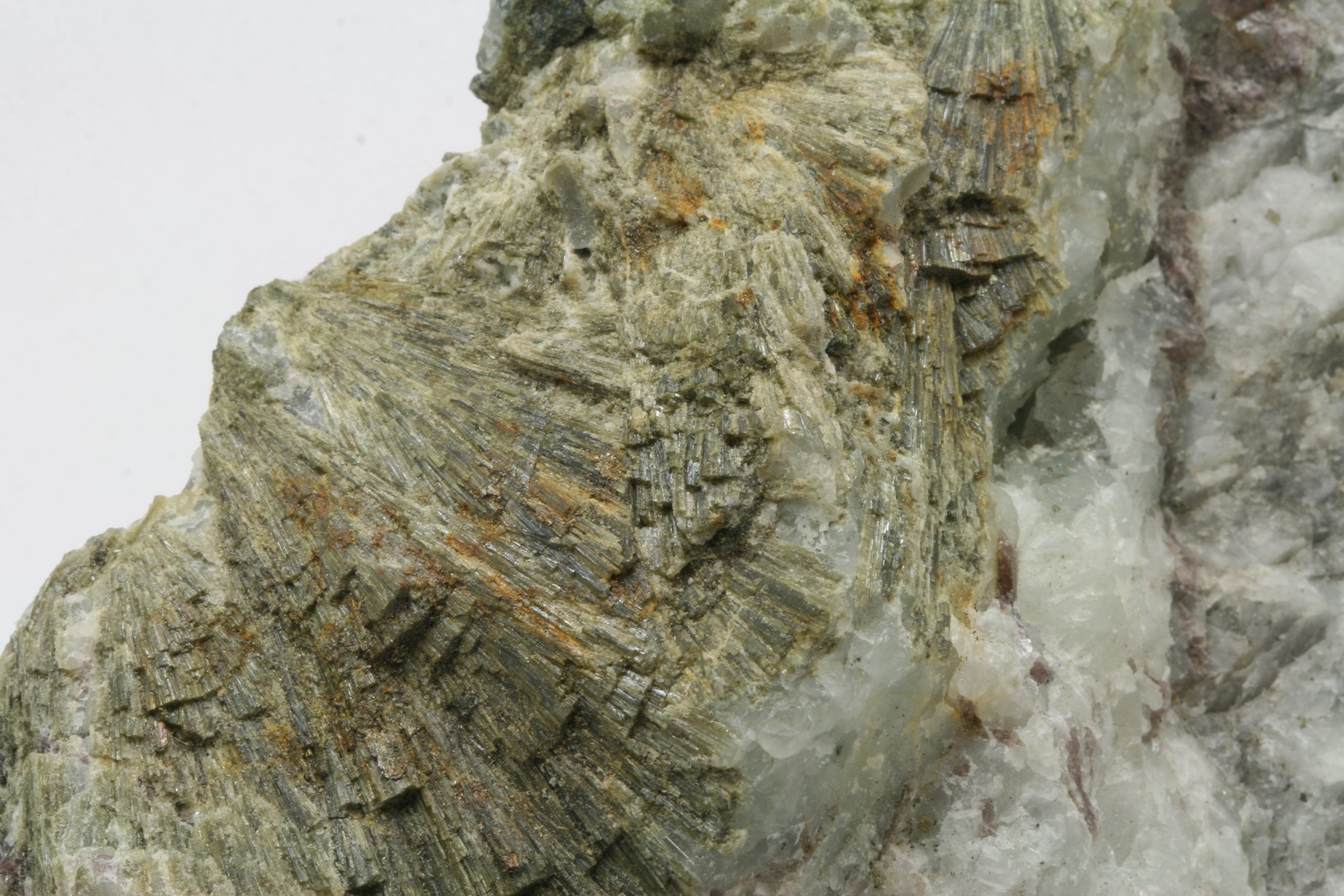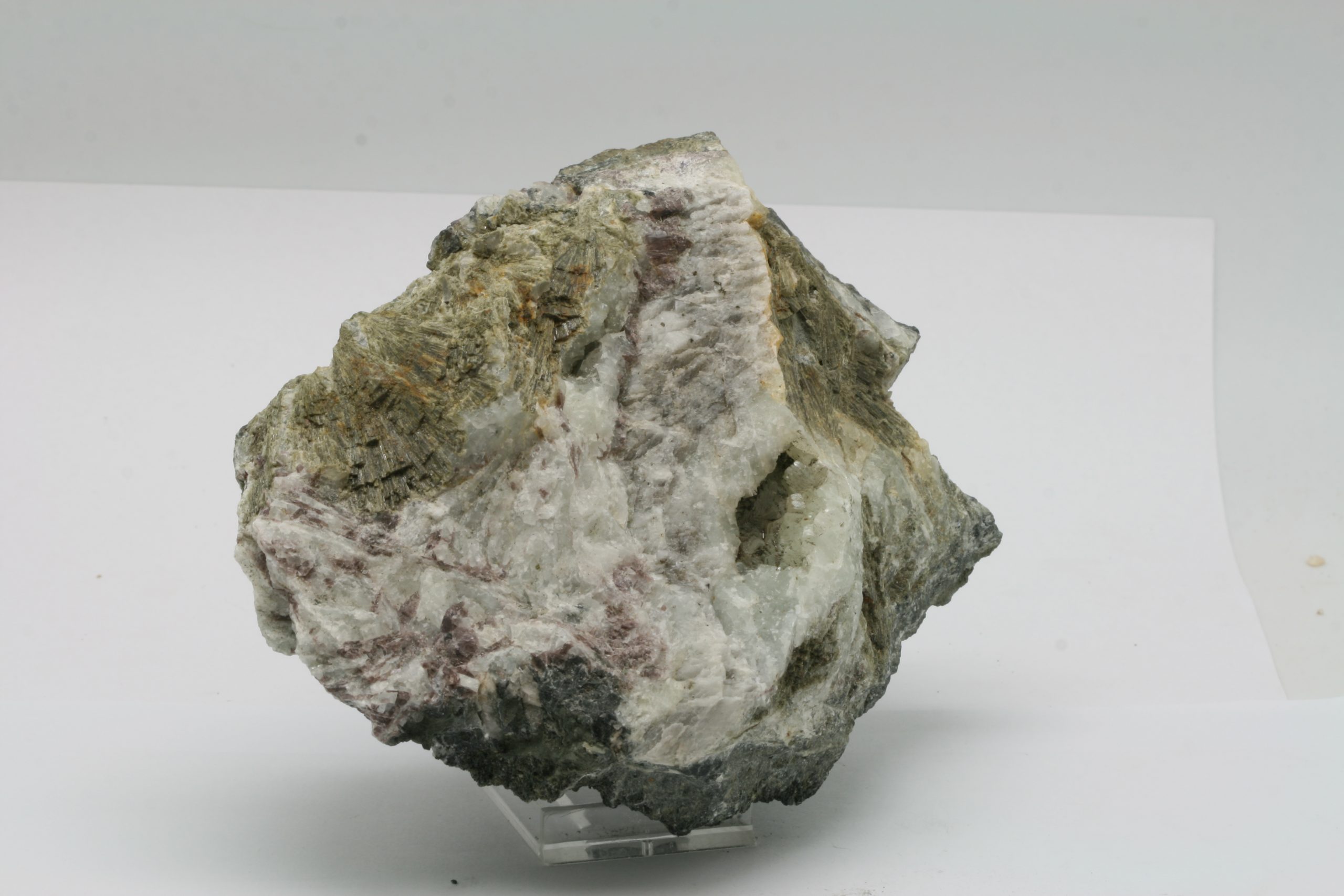 Fan-shaped green zoisite with kidney-shaped aggregates of prehnite and purple axinite.
