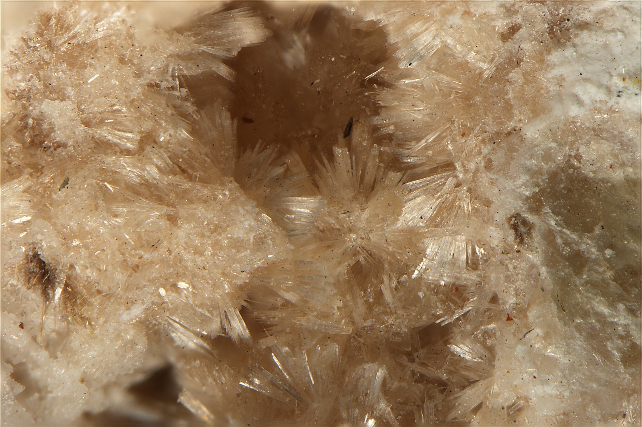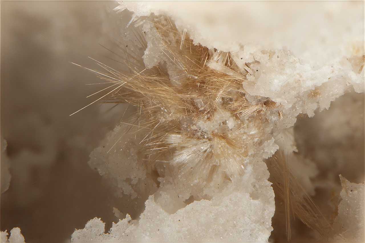 A rich small sample of light pink acicular crystals of the extremely rare (1 locality in the world) silicate zorite together with similarly rare raite, which forms clusters of very thin acicular orange-brown crystals. For both minerals, this deposit is the type locality.
