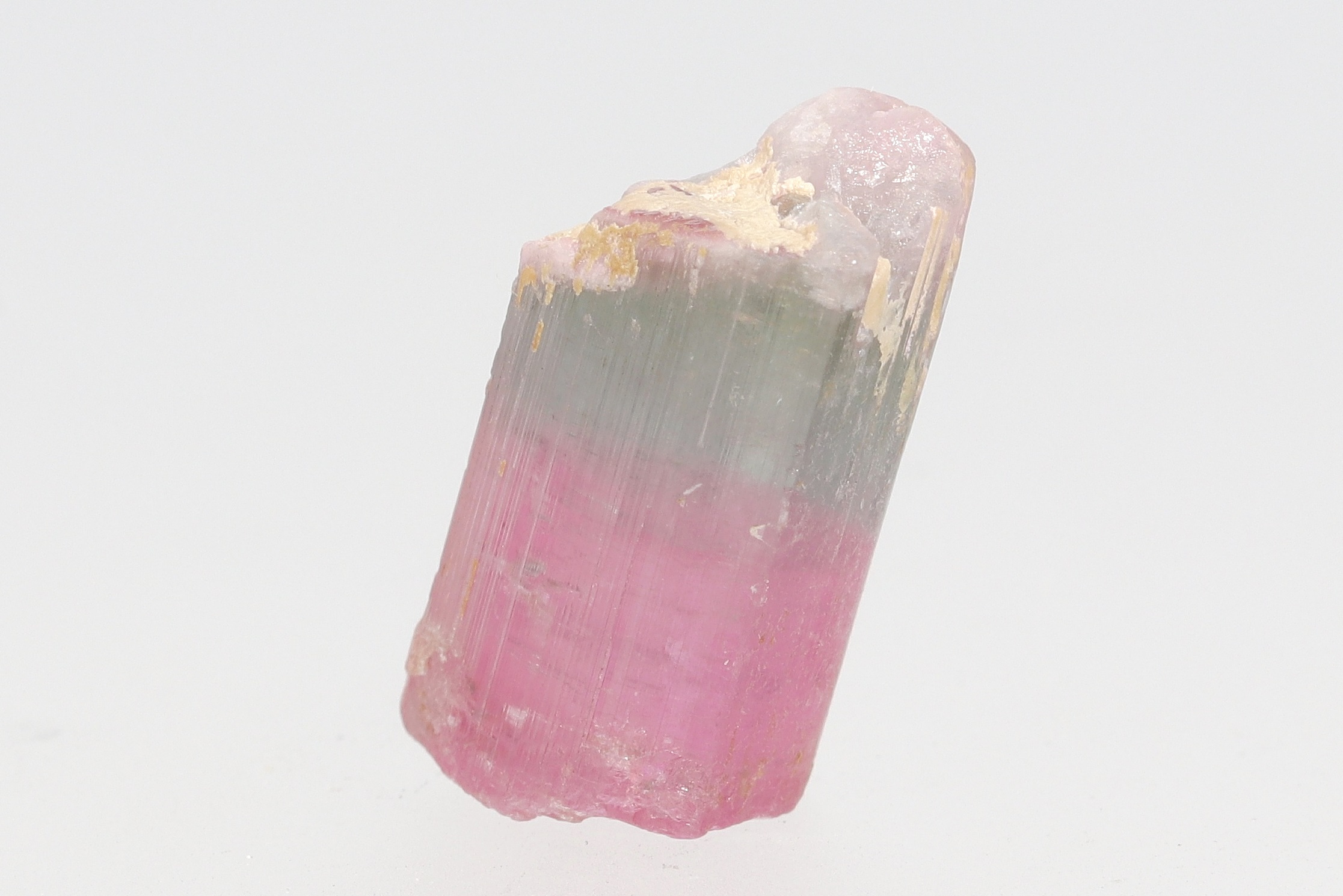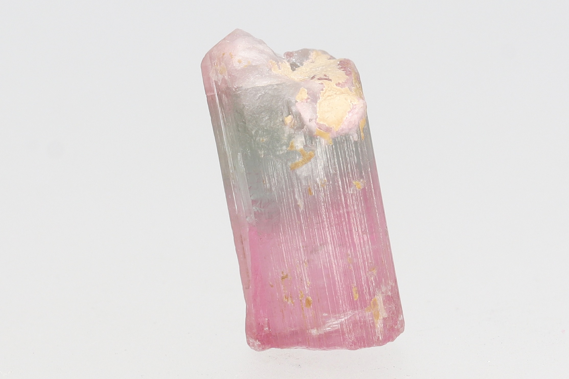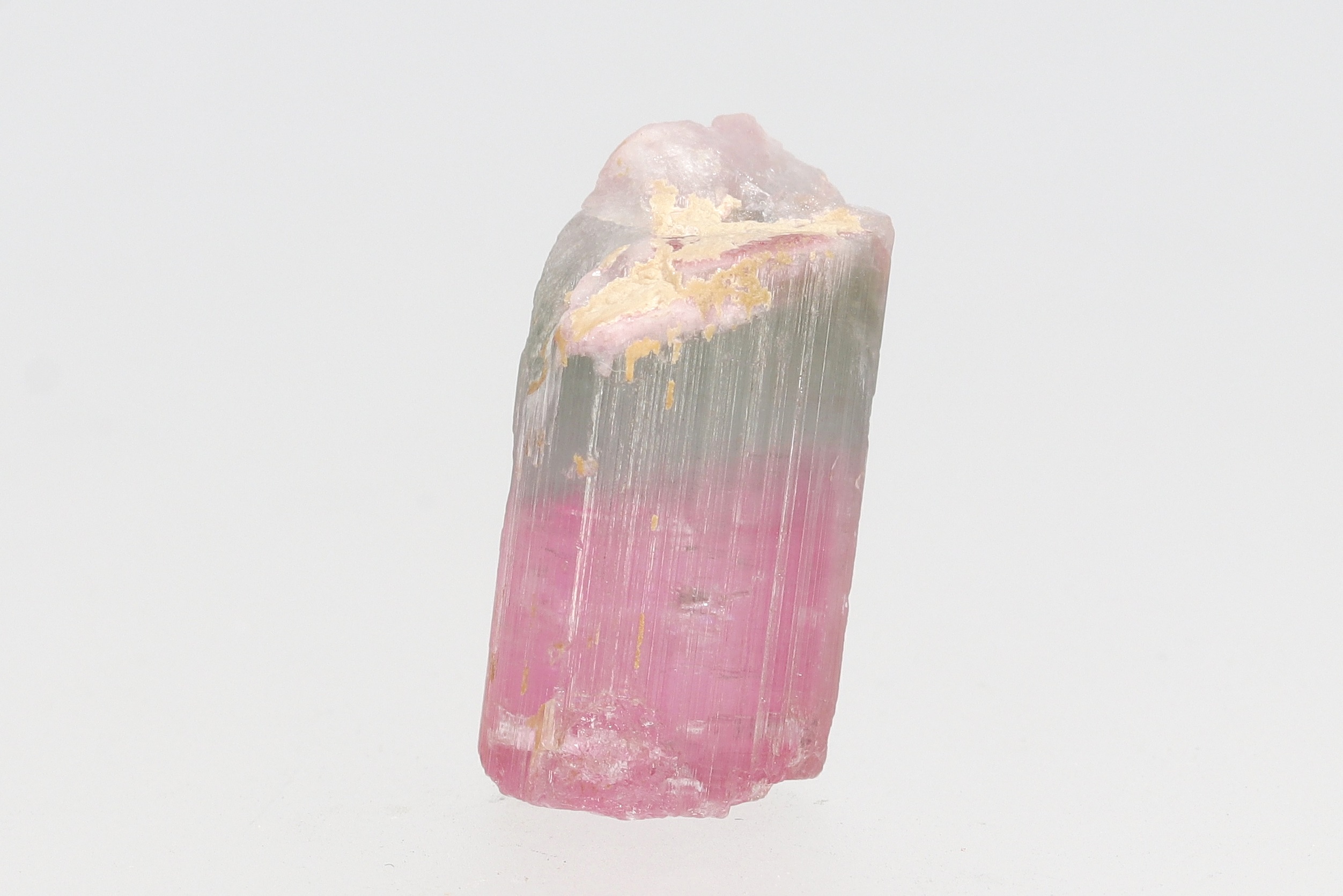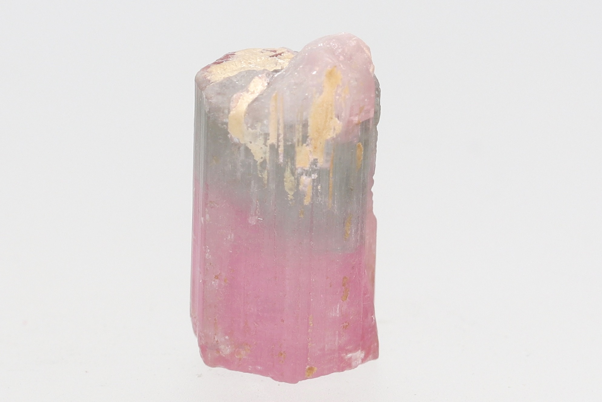A historical specimen of a two-color gem-quality tourmaline from a classic Californian locality. The crystal is terminated by etching at the top.