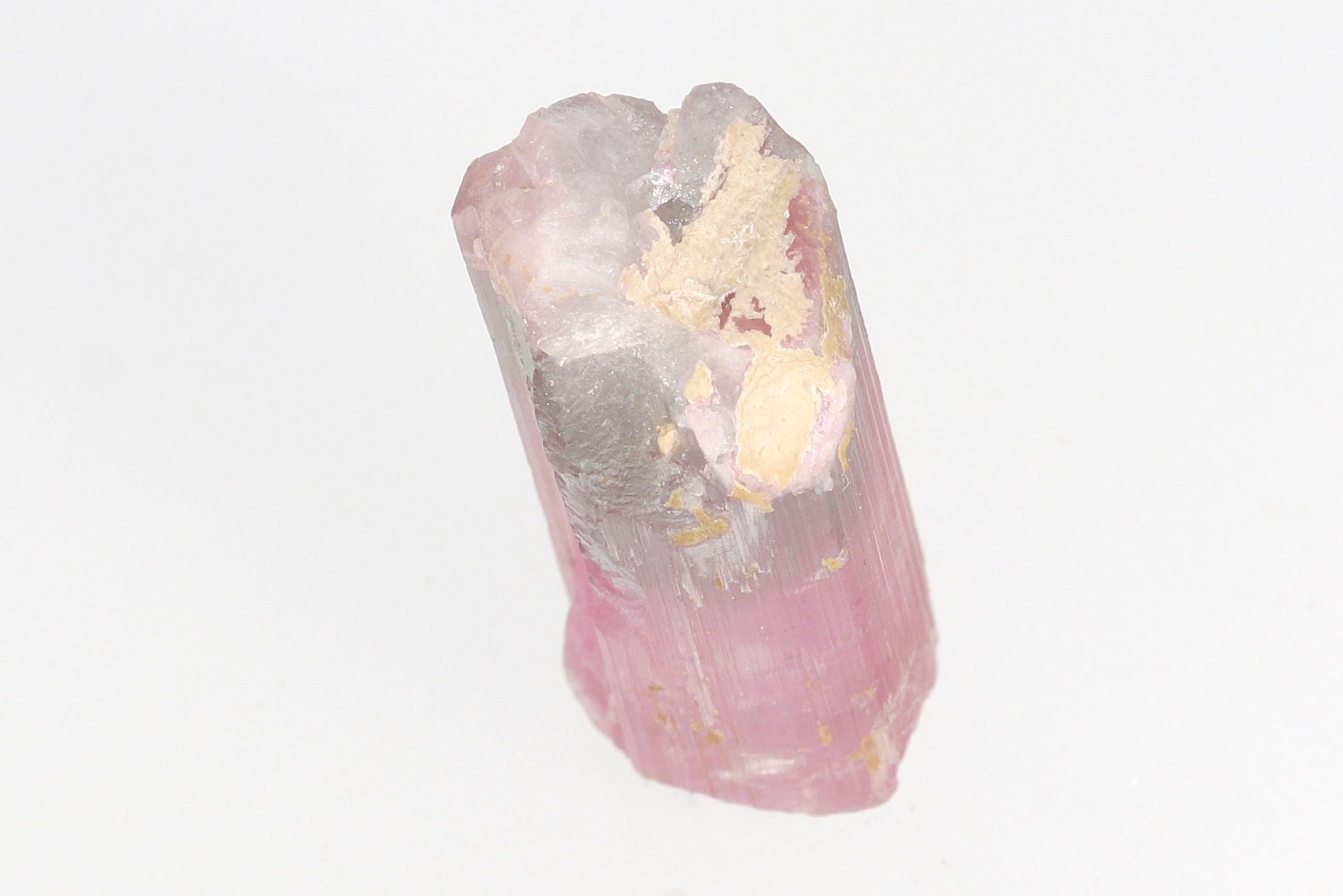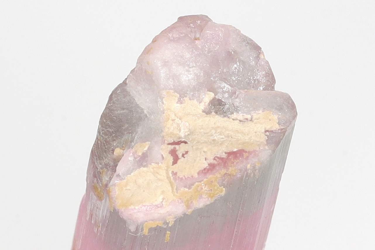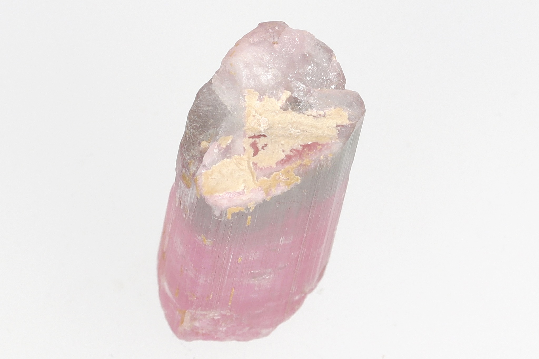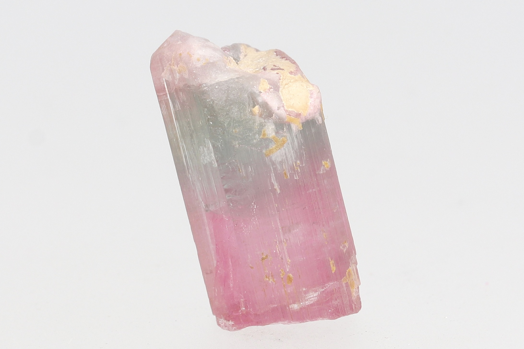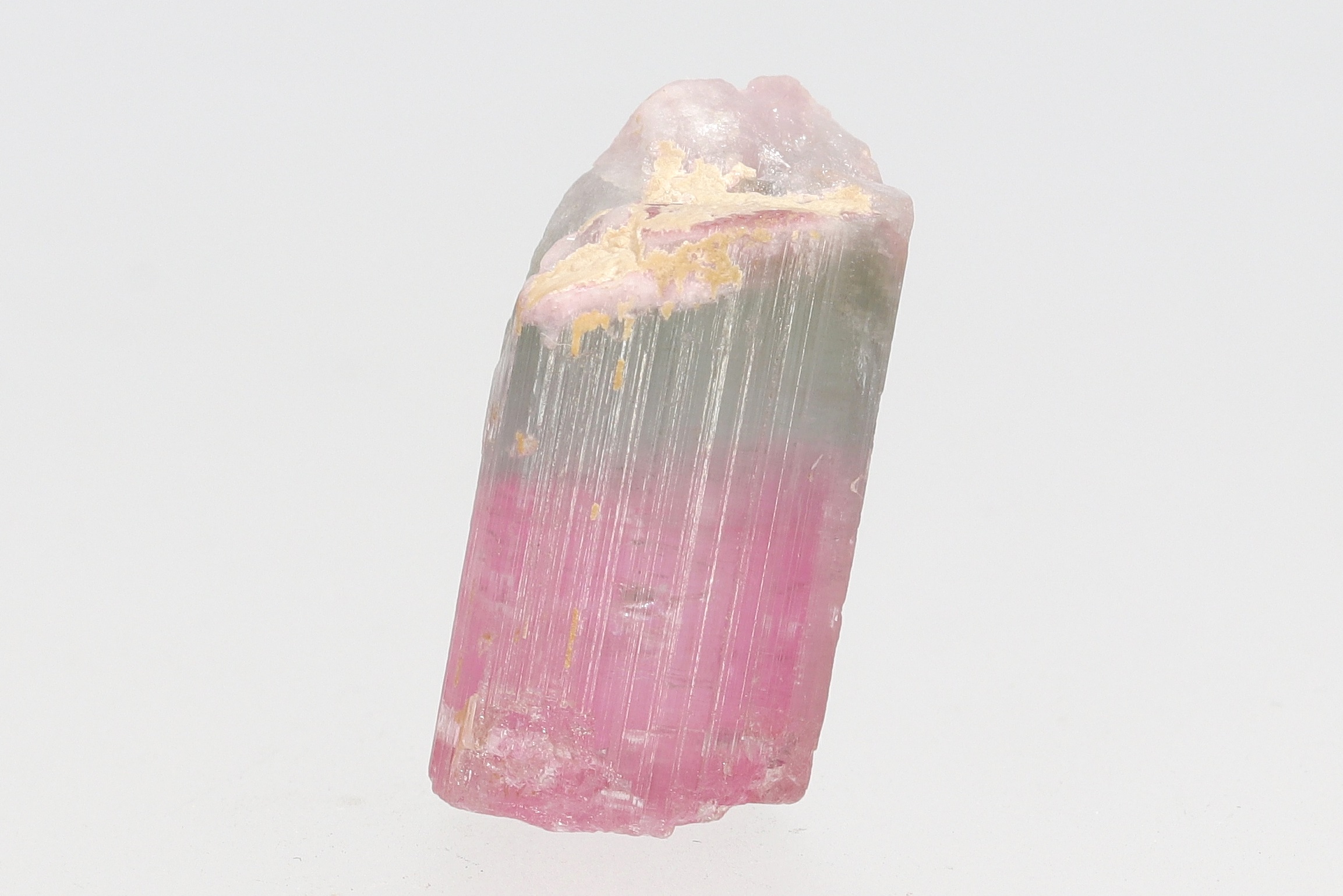 A historical specimen of a two-color gem-quality tourmaline from a classic Californian locality. The crystal is terminated by etching at the top.