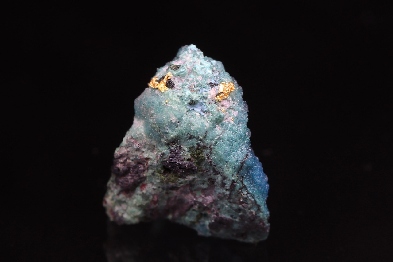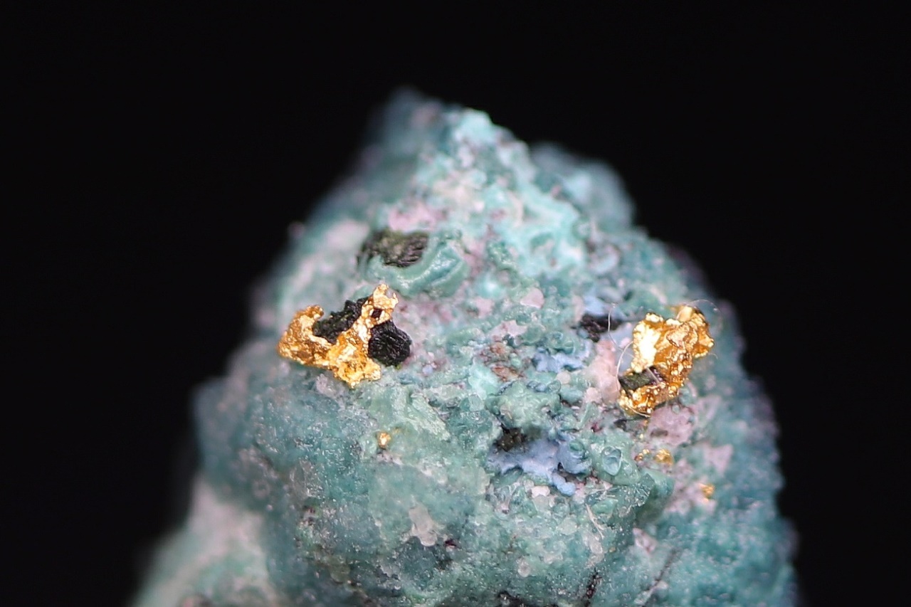Aggregates of pure gold up to 2 mm in size in quartz intergrown with secondary copper minerals.