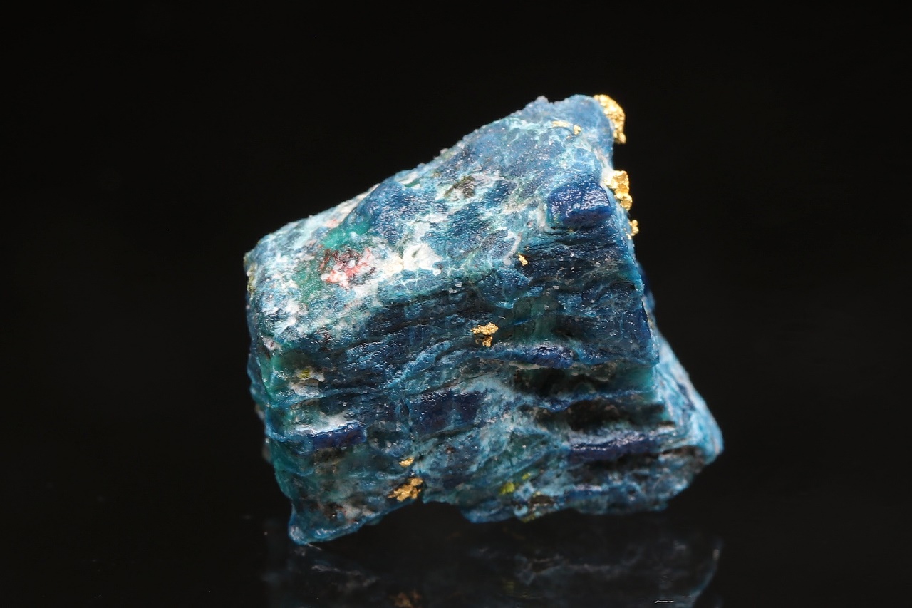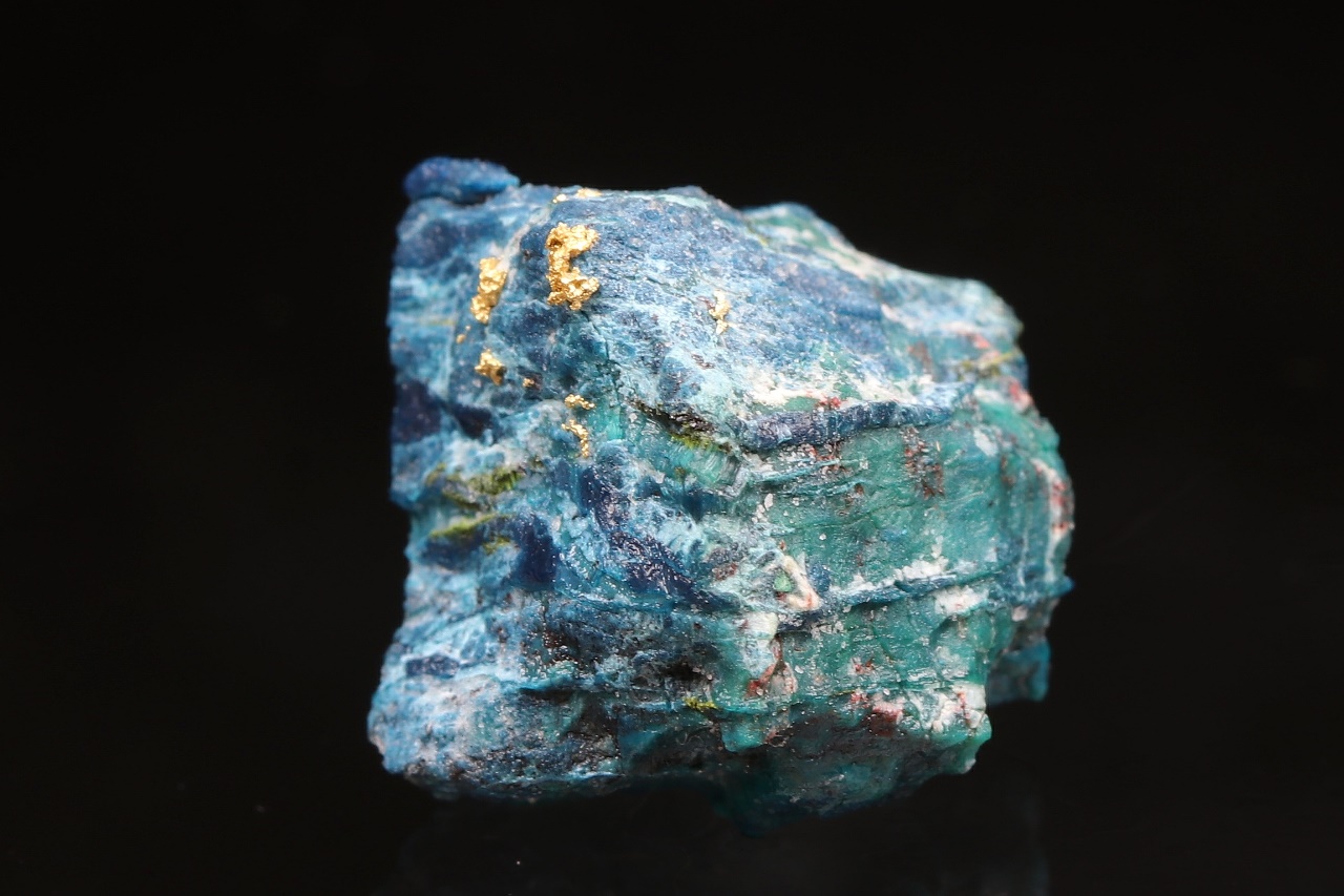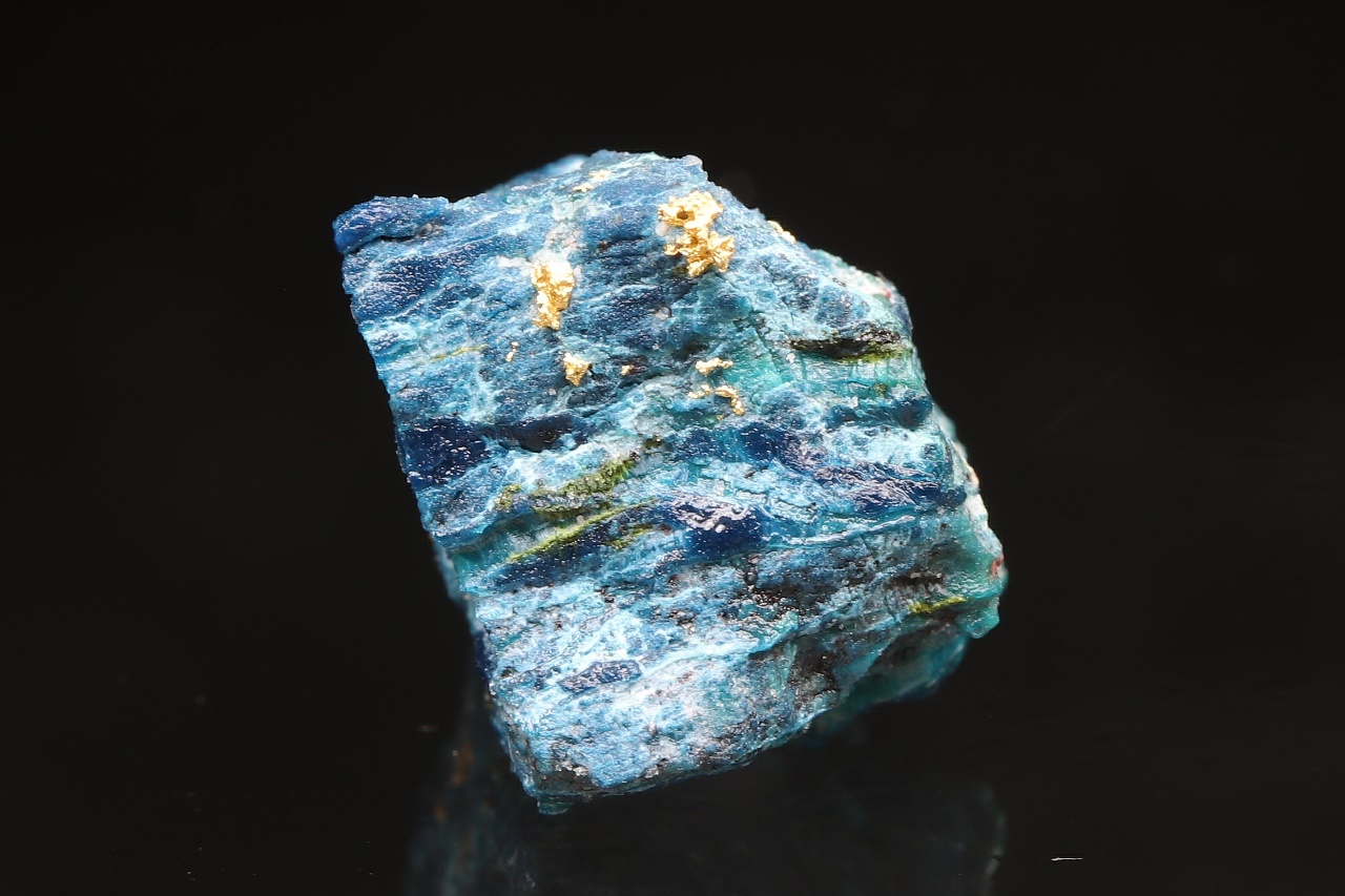 Aggregates of pure gold grown in intensely blue Shattuckite of gem quality. The largest aggregate is 2 mm in size.