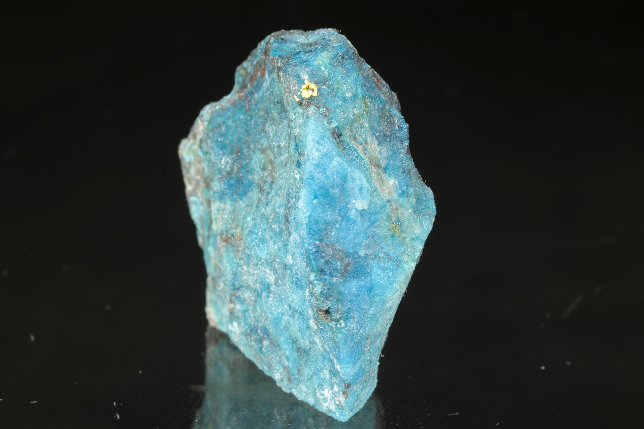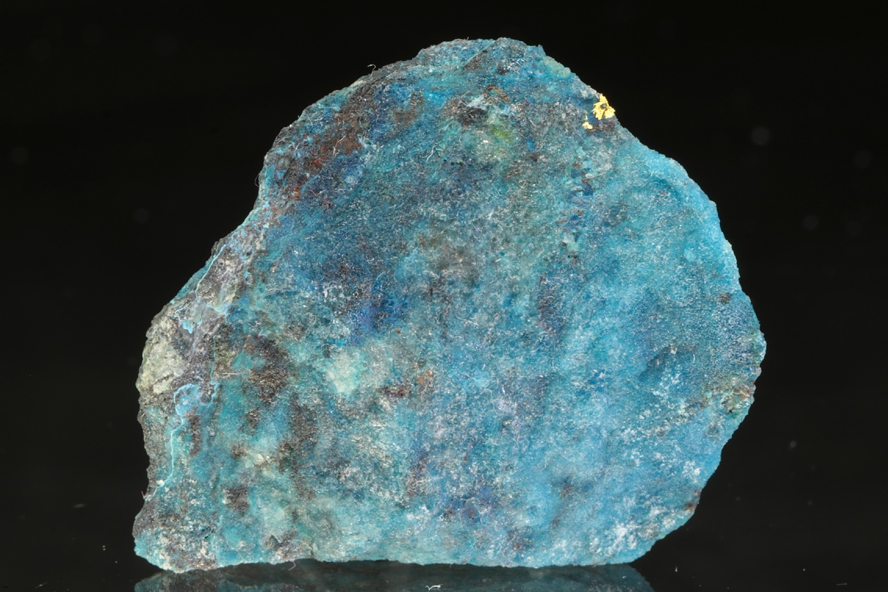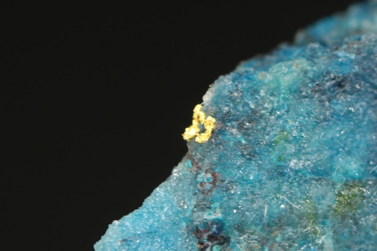 Unusual and very elegant combination of aggregates of pure gold in a contrasting intensely blue Shattuckite of gemstone quality. The gold aggregate is more than 1 mm in size.