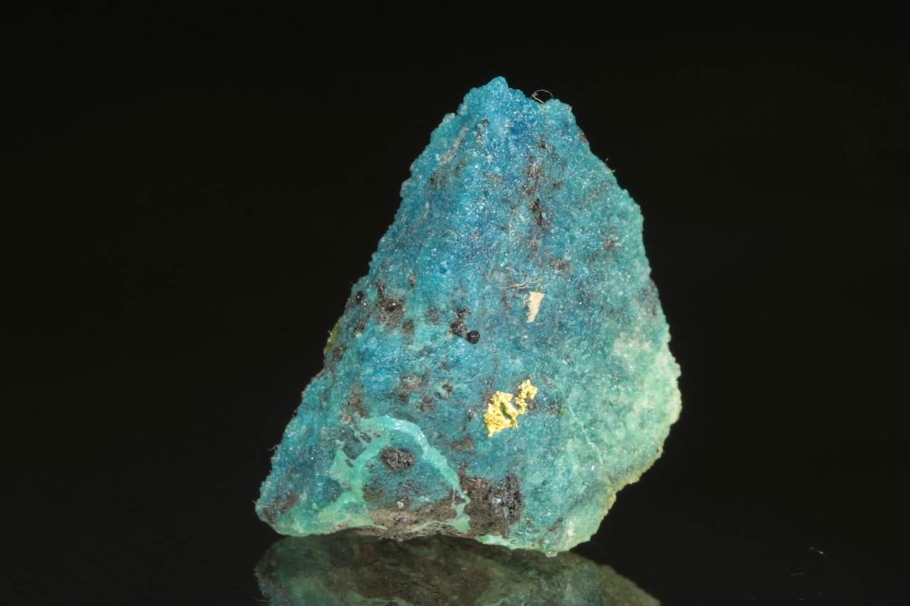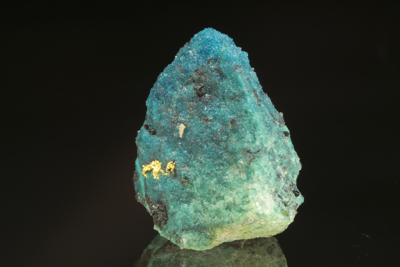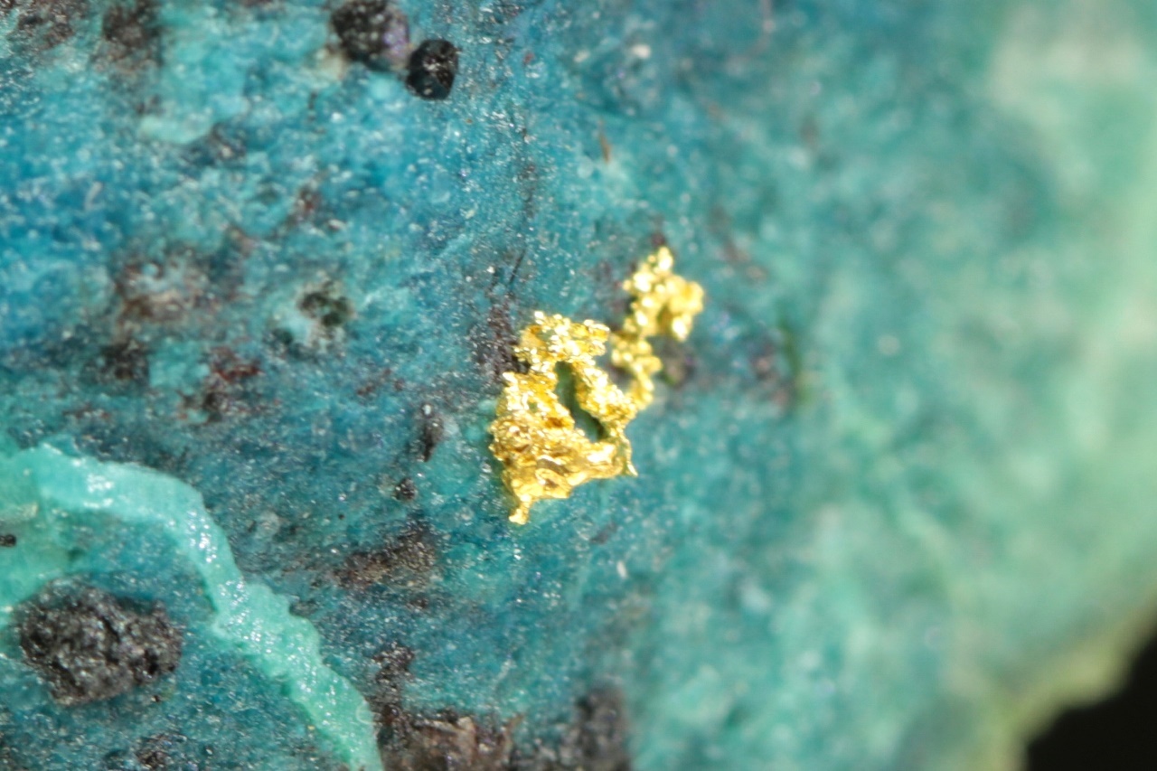 Unusual and very elegant combination of aggregates of pure gold in a contrasting intensely blue shattuckite of gemstone quality. The gold aggregate is 3 mm in size.
