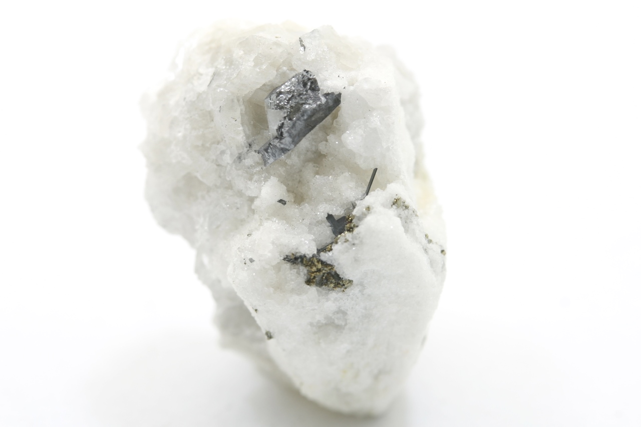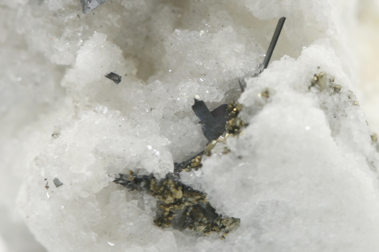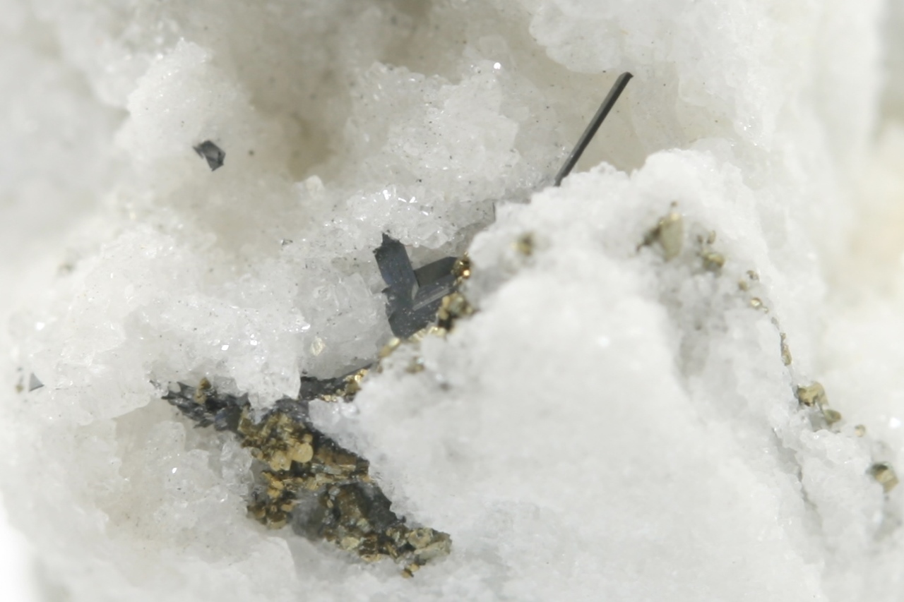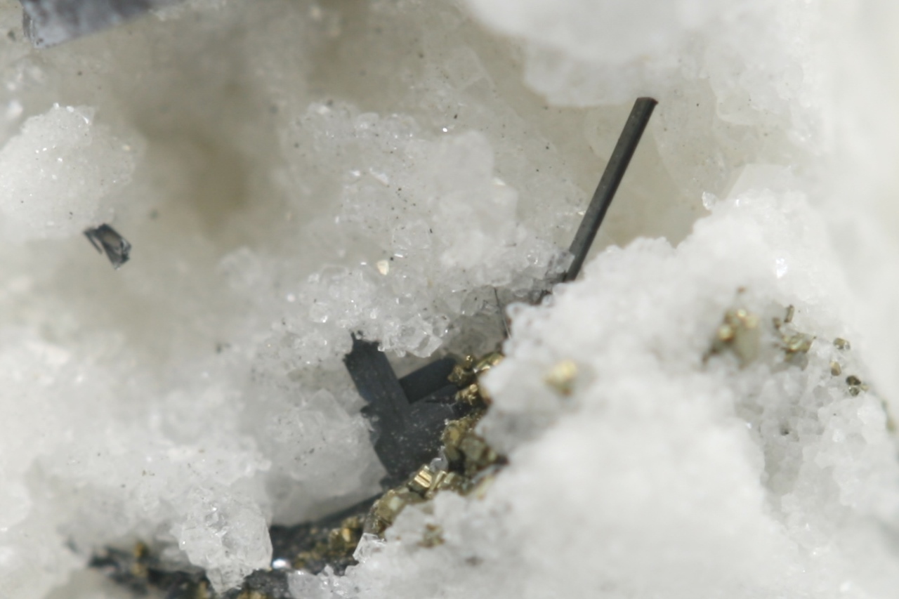 A 1.5 mm sartorite needle with tabular lengenbachite (TL) with shiny black jordanite.