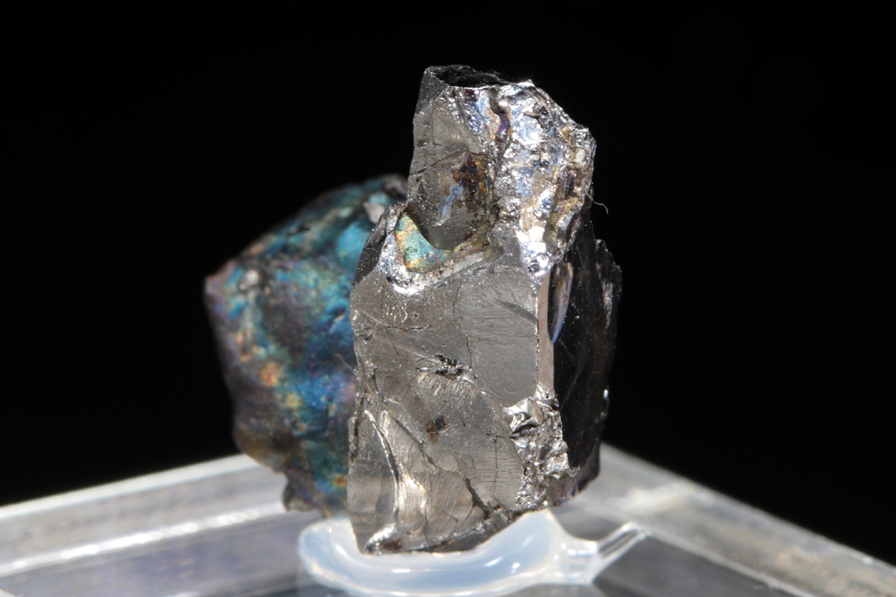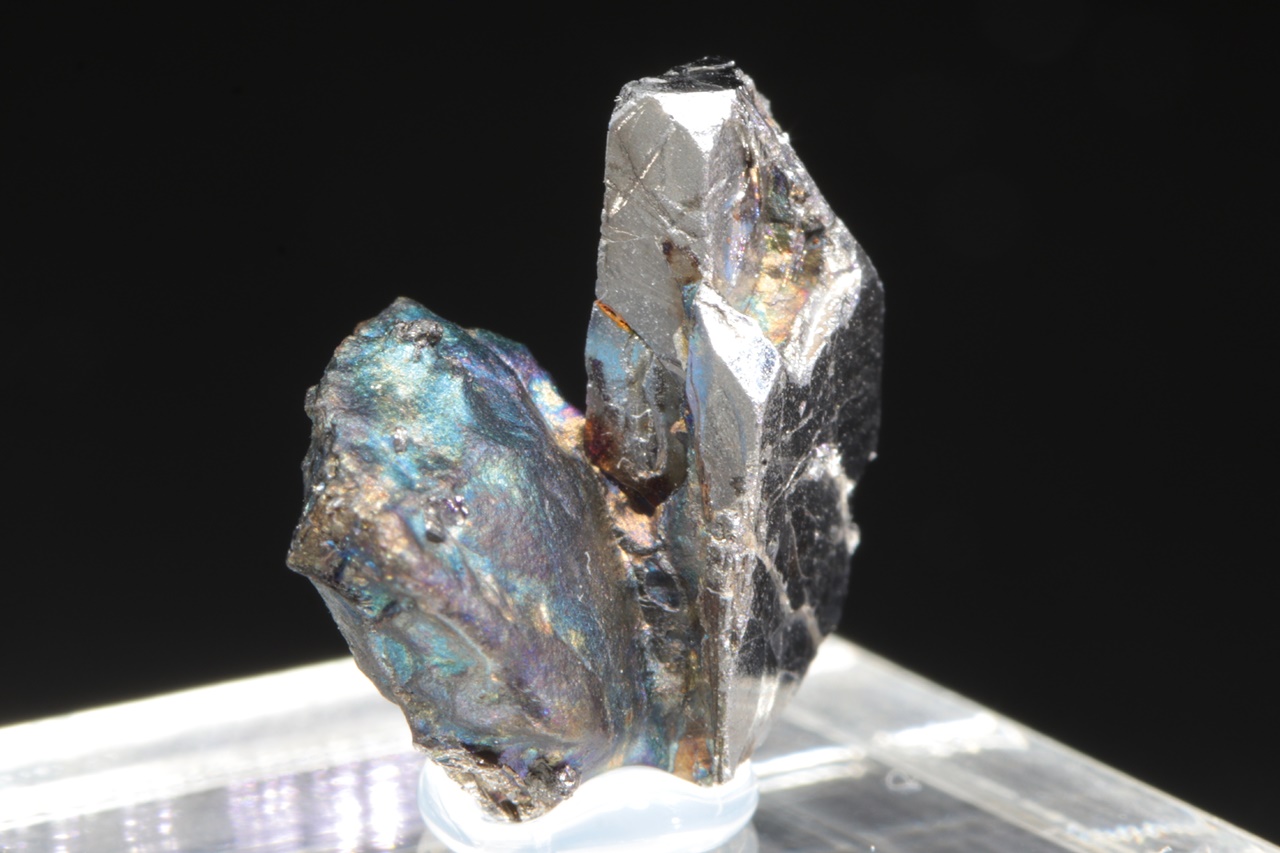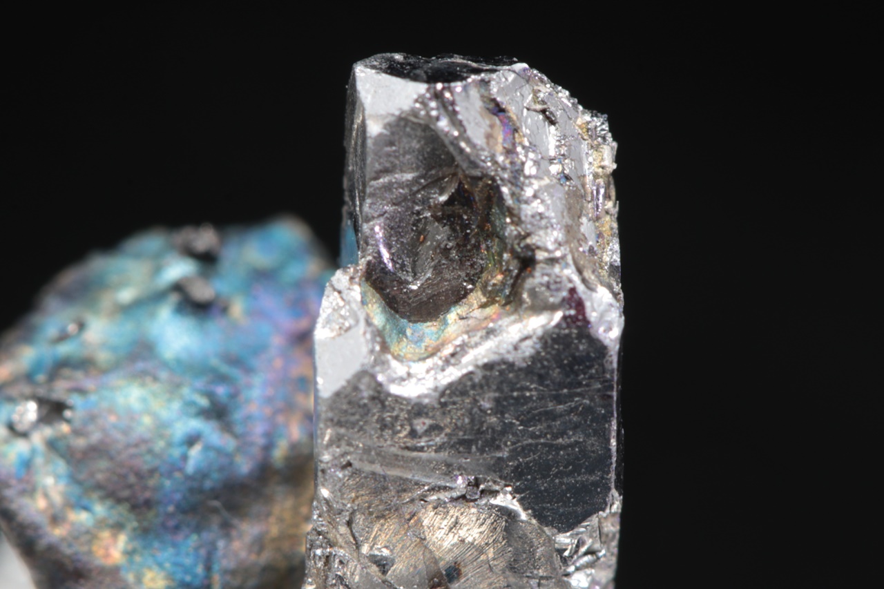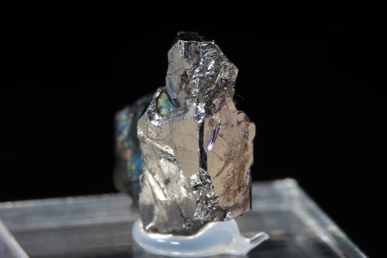 Elegant, very long sperrylite crystal which is topped with skeletal development. The length of the crystal is 11 mm. A small base of the crystal consists of iridescent chalcopyrite. Sperrylites from this locality are among the best in the world in terms of size and their intense luster.