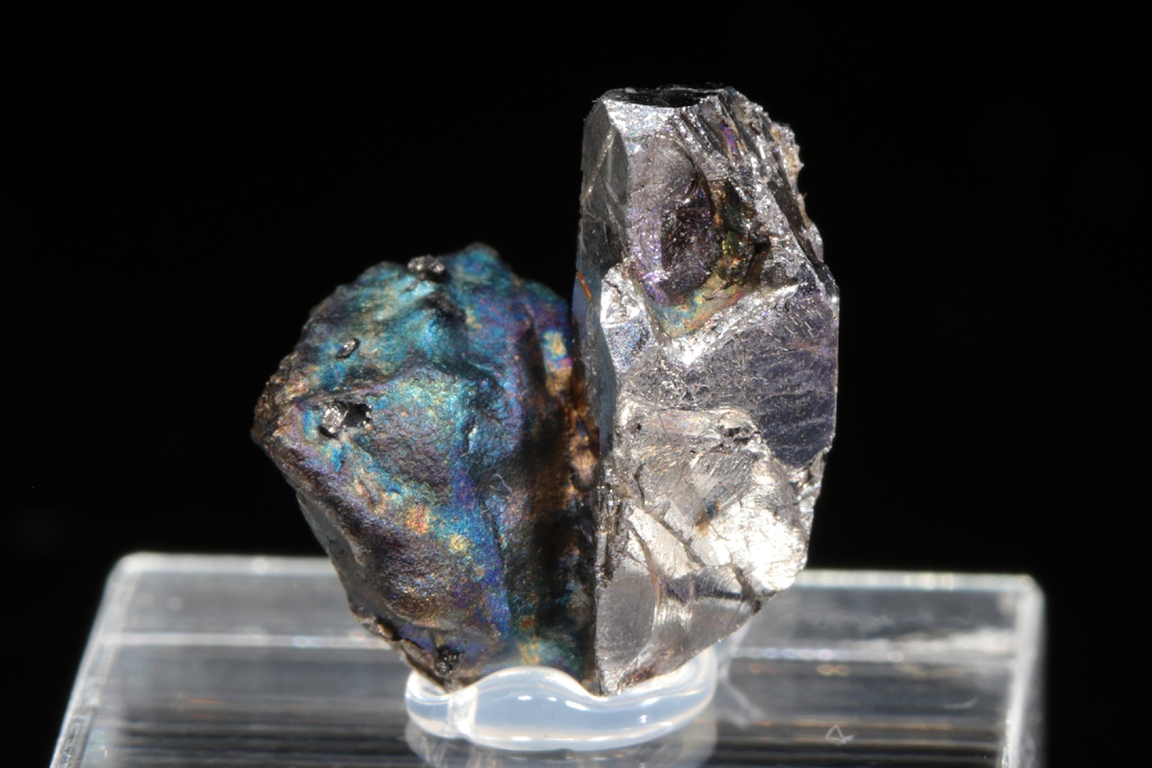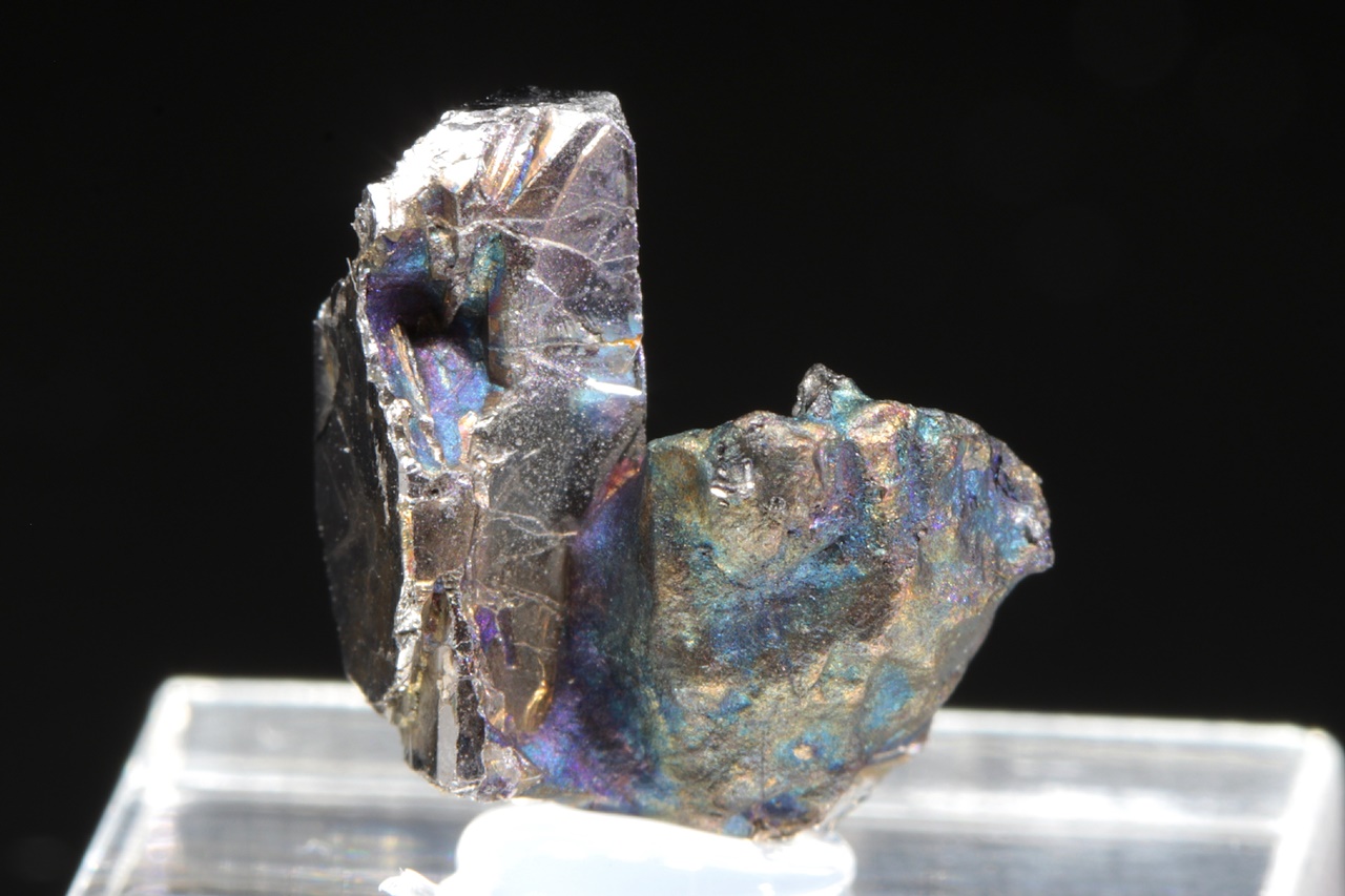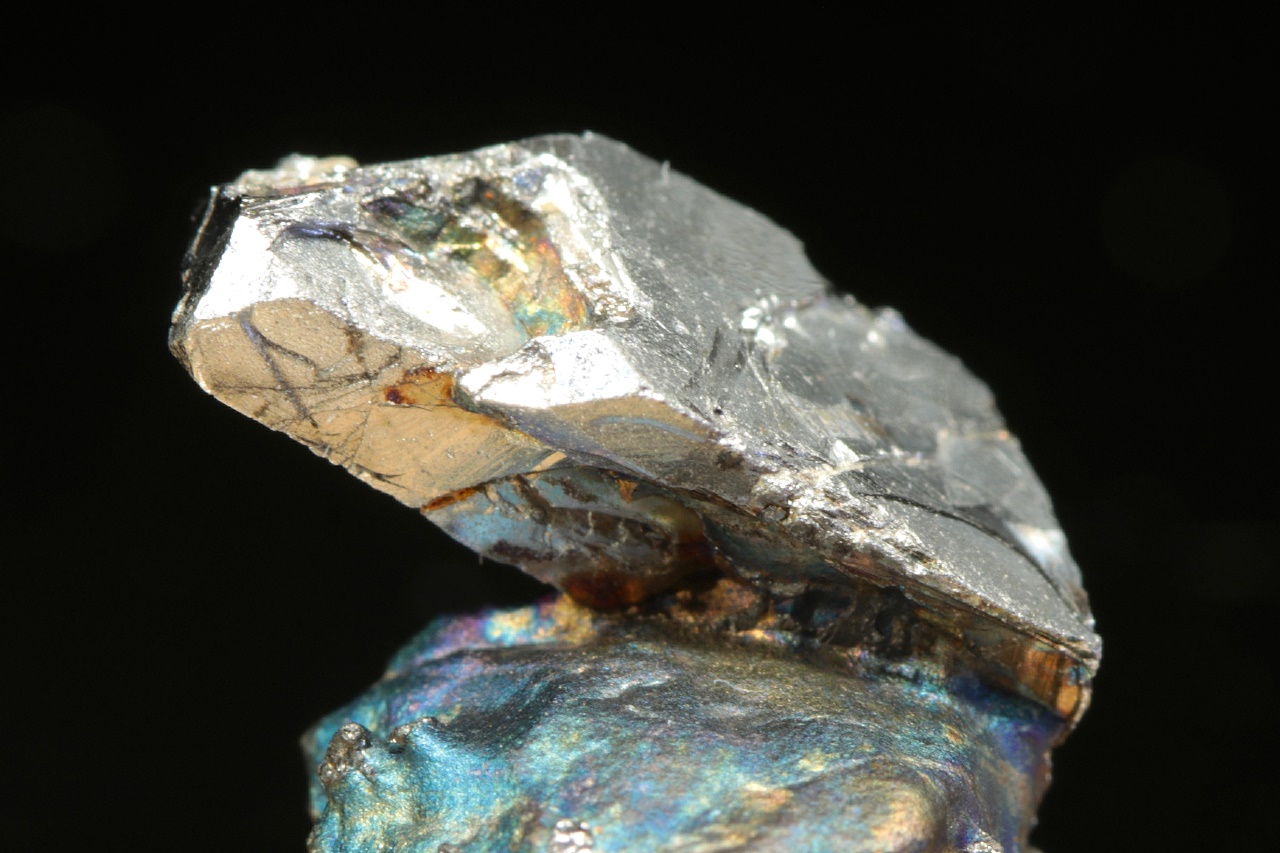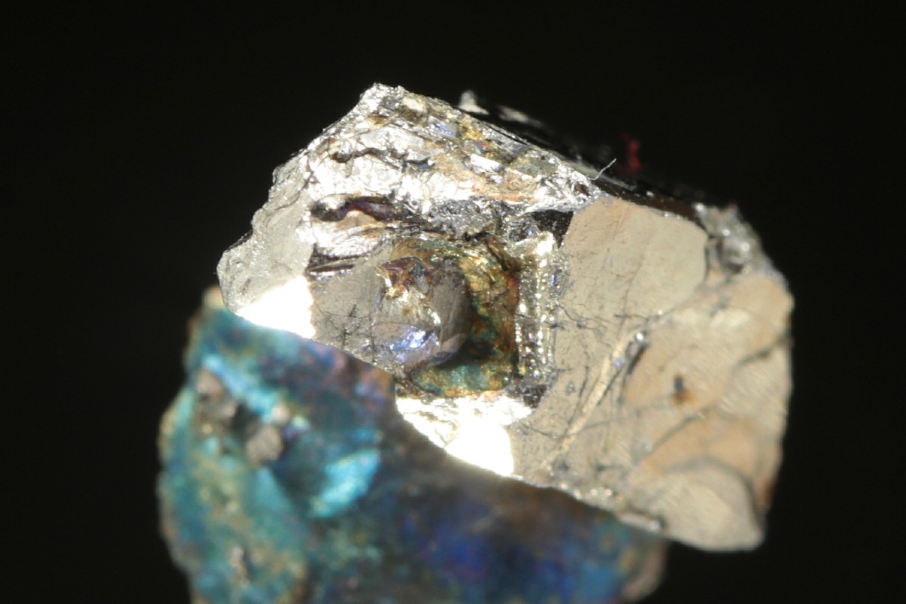 Elegant, very long sperrylite crystal which is topped with skeletal development. The length of the crystal is 11 mm. A small base of the crystal consists of iridescent chalcopyrite. Sperrylites from this locality are among the best in the world in terms of size and their intense luster.