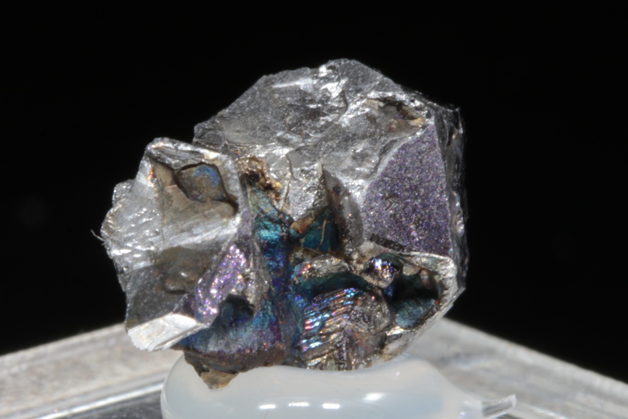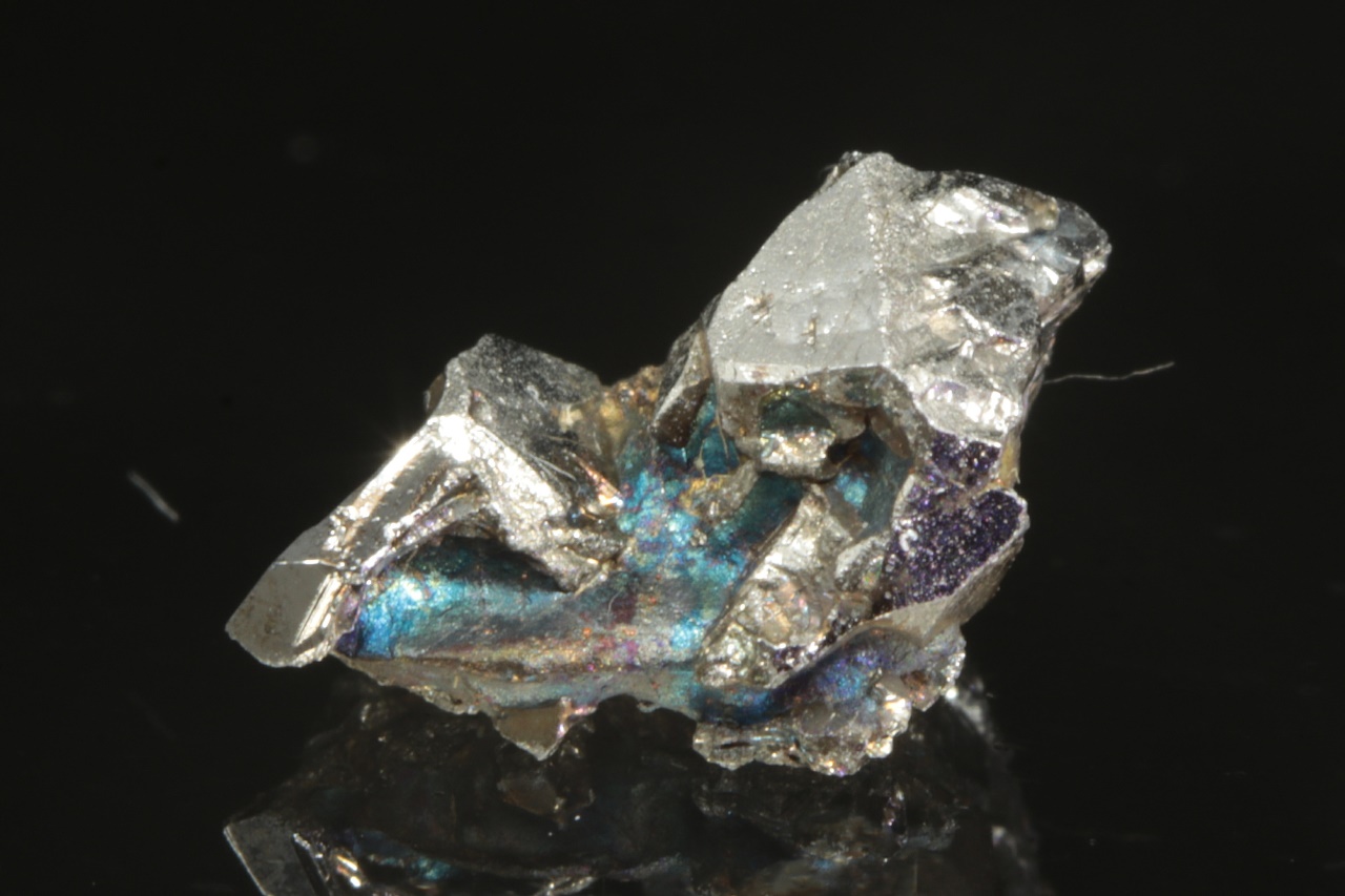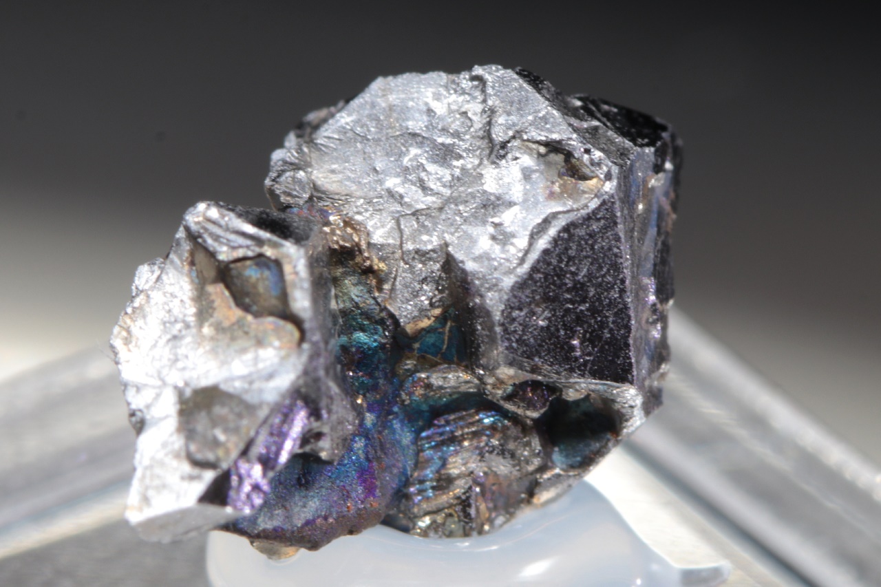 The intergrowth of two crystals of sperrylite, measuring 5 and 4 mm, with chalcopyrite exhibiting pronounced iridescent colors. .