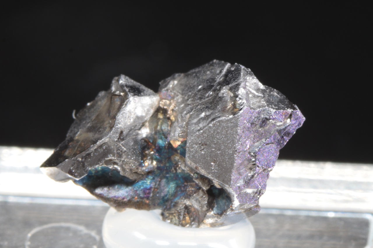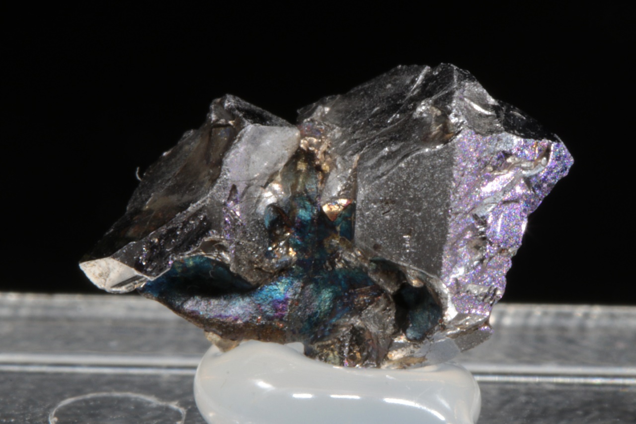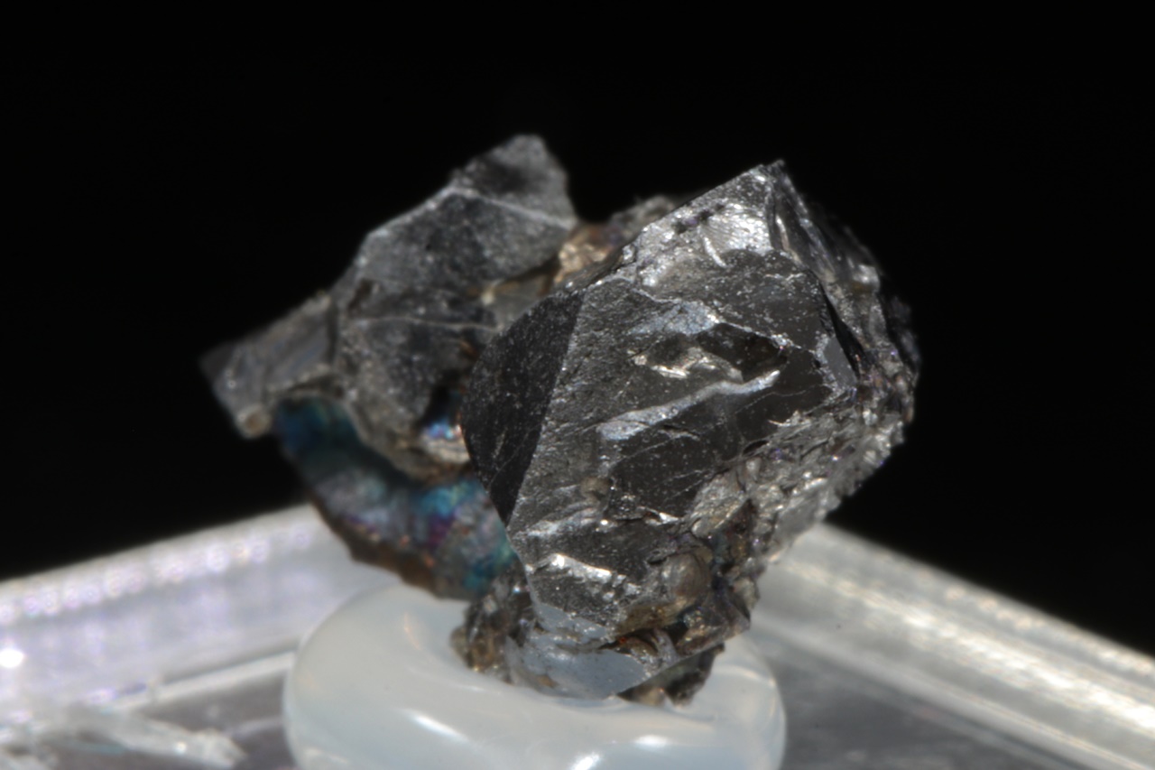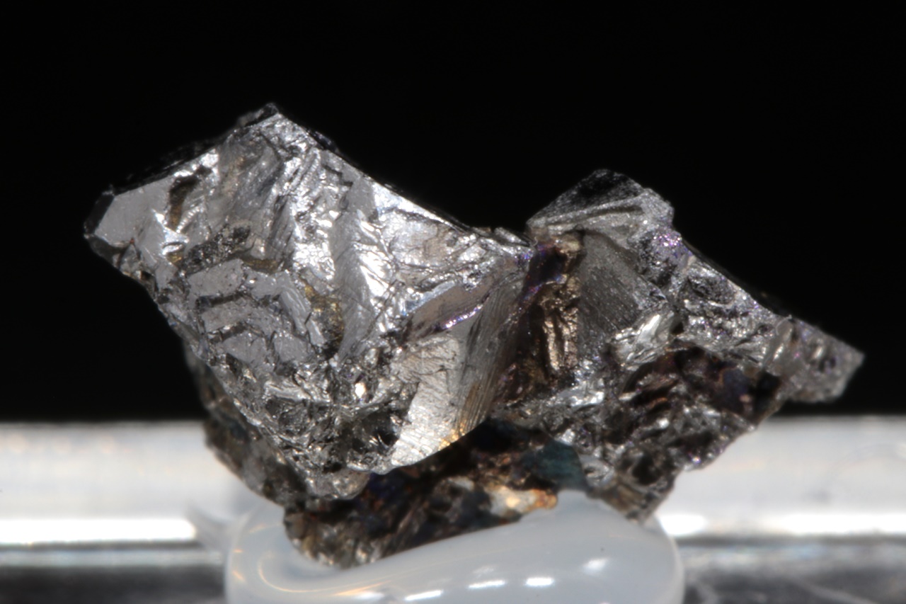 The intergrowth of two crystals of sperrylite, measuring 5 and 4 mm, with chalcopyrite exhibiting pronounced iridescent colors. .