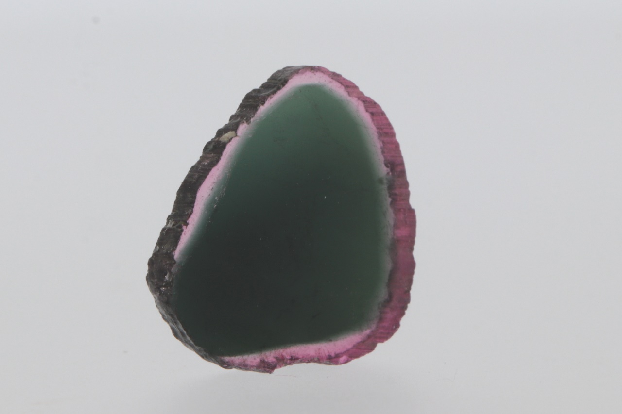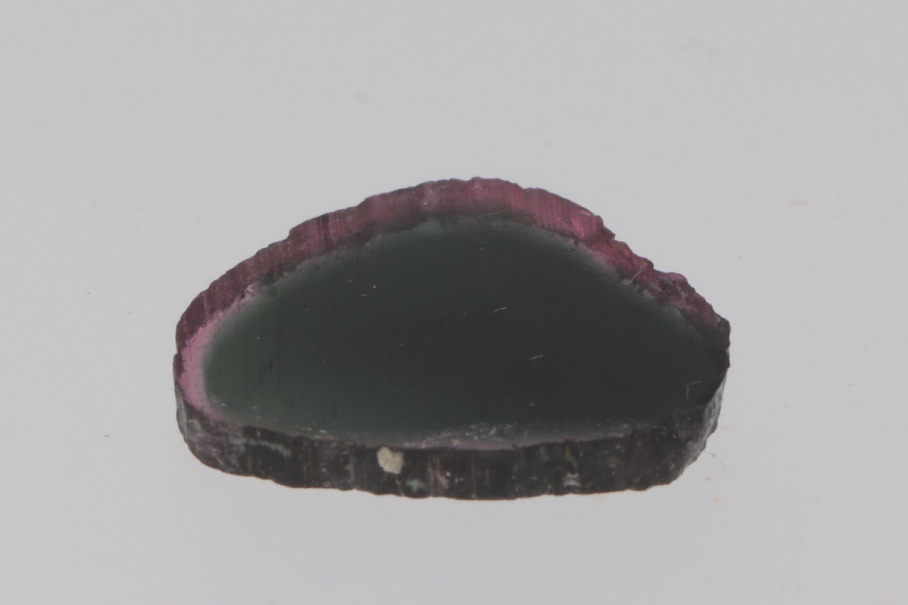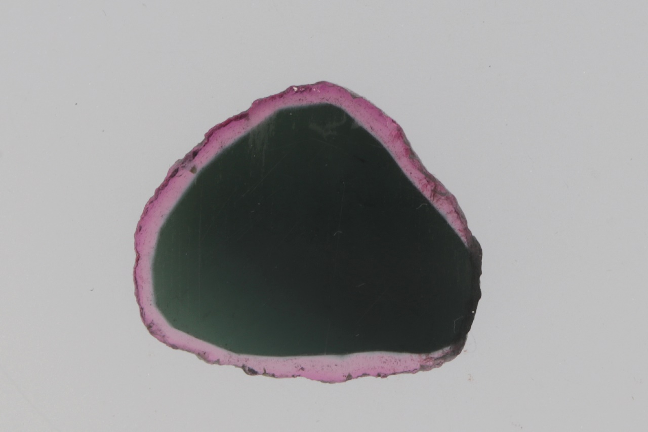 Double-sided polished slice of tourmaline with a dark green center and a pinkish edge.