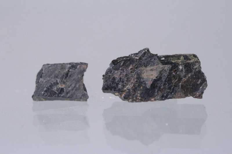 An interesting specimen of the rare yttrium-rich variety of titanite from Norway. A specimen of two black-brown polished slabs of rare yttrium titanite; dimensions are provided for the larger slab.