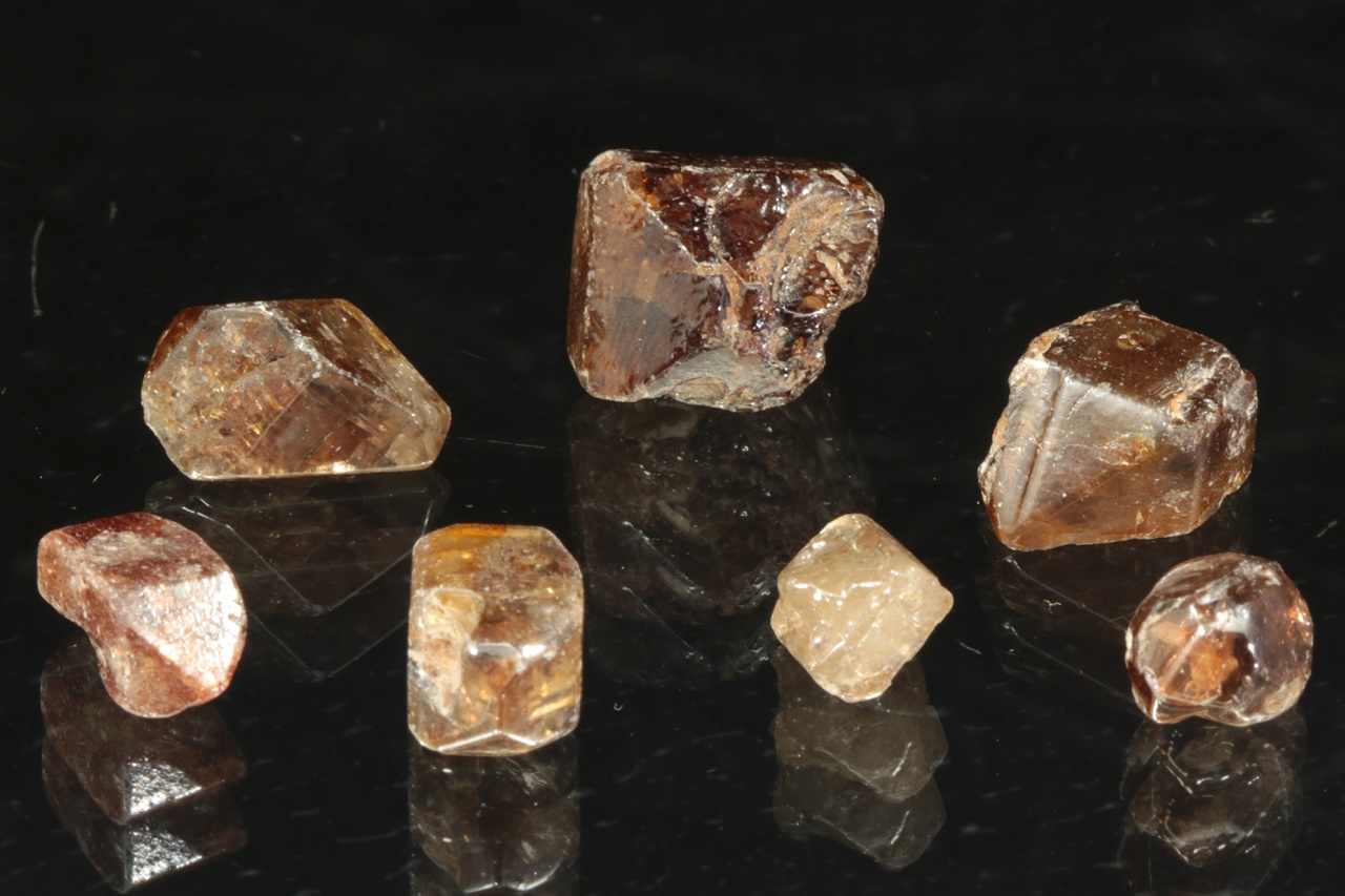 Crystals of honey brown zircon. The largest crystal is 1.5 cm big.
